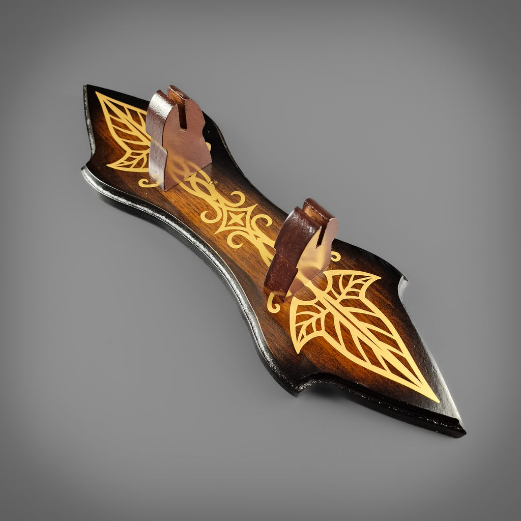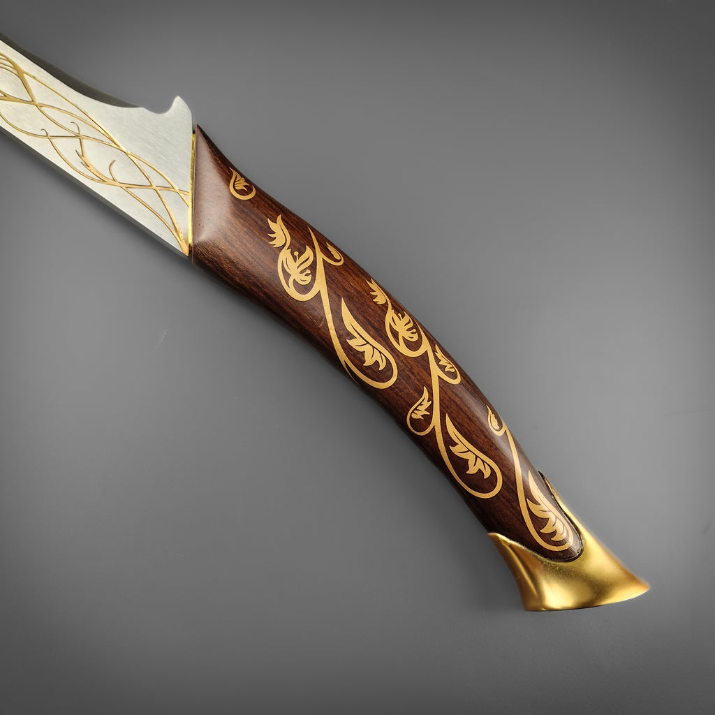Solid metal pommel. Wooden handgrip, Elven vine design. 420 stainless steel blade, sharp-edged. Wooden display stand. Certificate of authenticity.