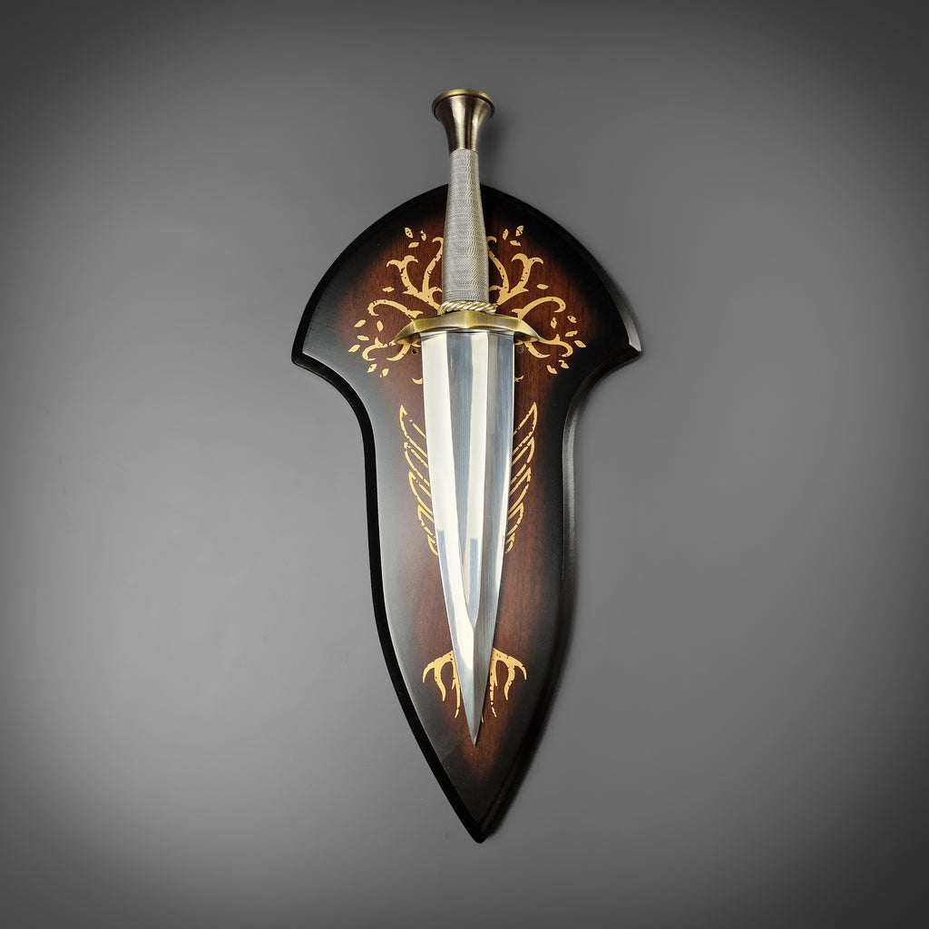 The 5mm thick 420 stainless steel blade boasts a sleek satin finish, perfectly capturing the craftsmanship of Gondor. At 14 inches overall, with an 8 3/4 inch blade length, this dagger is a true-to-life reproduction, designed for fans and collectors alike. The handle, made from durable ABS, is wrapped in wire, ensuring a comfortable and secure grip, while the included wall plaque allows you to proudly display Boromir’s legendary dagger in your home.