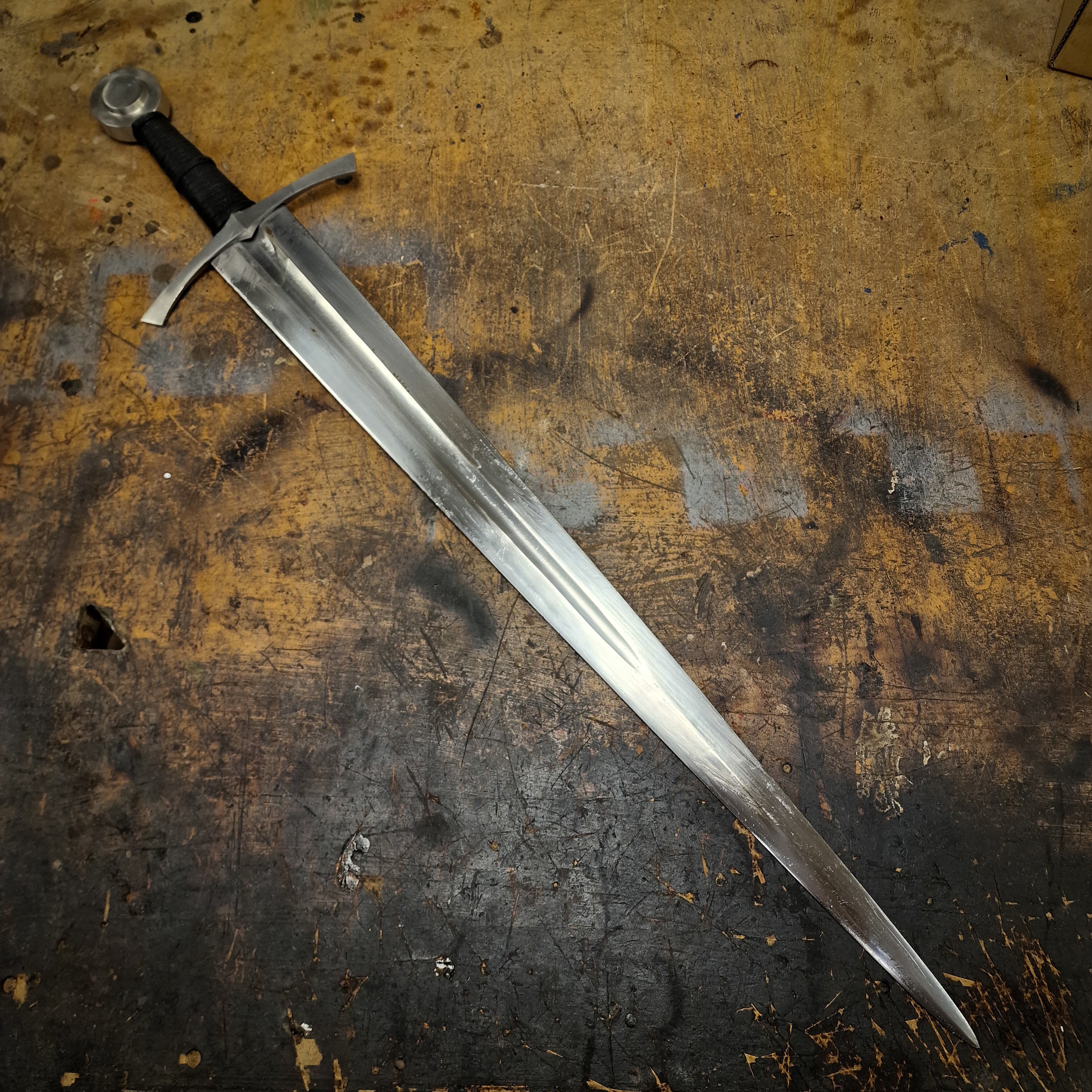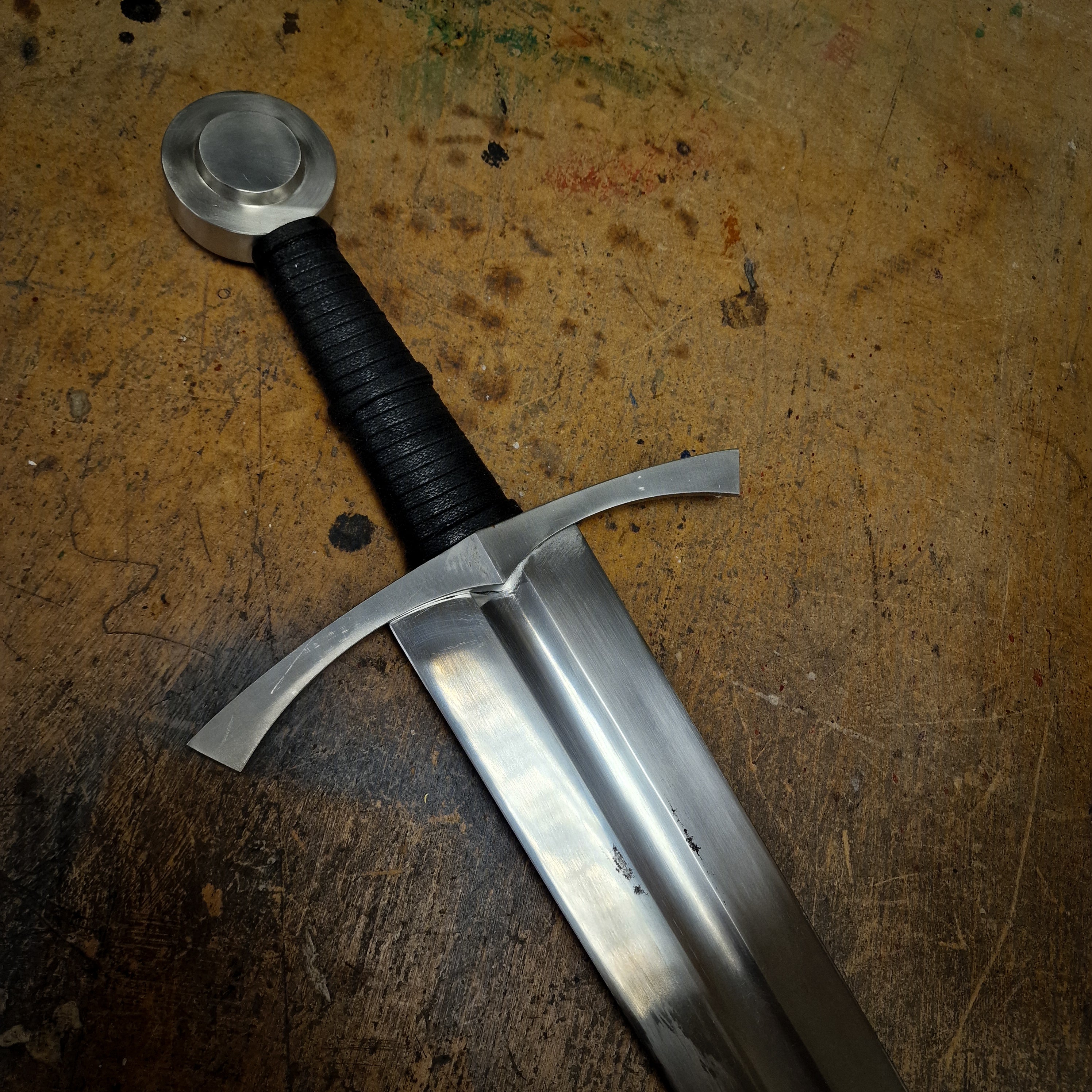 In the European High Middle Ages, the typical sword was a straight, double-edged weapon with a single-handed cross-shaped hilt and a blade length of about 70 to 80 centimetres. Kingsguard is a fantastic replica example of this, with a tapered blade with central fuller, balanced against a wheel pommel. The grip is wrapped tightly in narrow cord with a upturned cross guard, and the sword is housed in an exceptional black scabbard with steel fittings. A fantastic sword befitting of any collection.