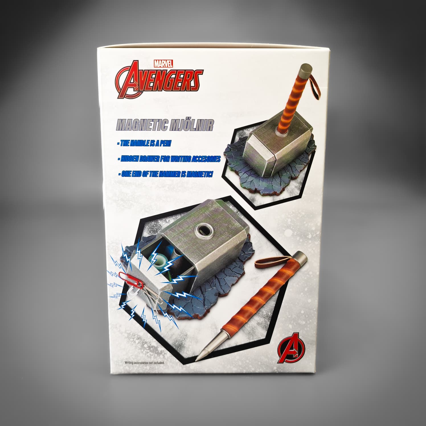 This officially licensed Marvel desk organiser and writing set brings a heroic touch to your workspace while offering practical everyday use. Made from durable ABS and PU, the design recreates the impact effect of Mjölnir, featuring a removable pen that forms the hammer’s handle. The pen writes in smooth black ink and can be pulled out easily whenever you need to jot down notes, reminders or quick ideas.