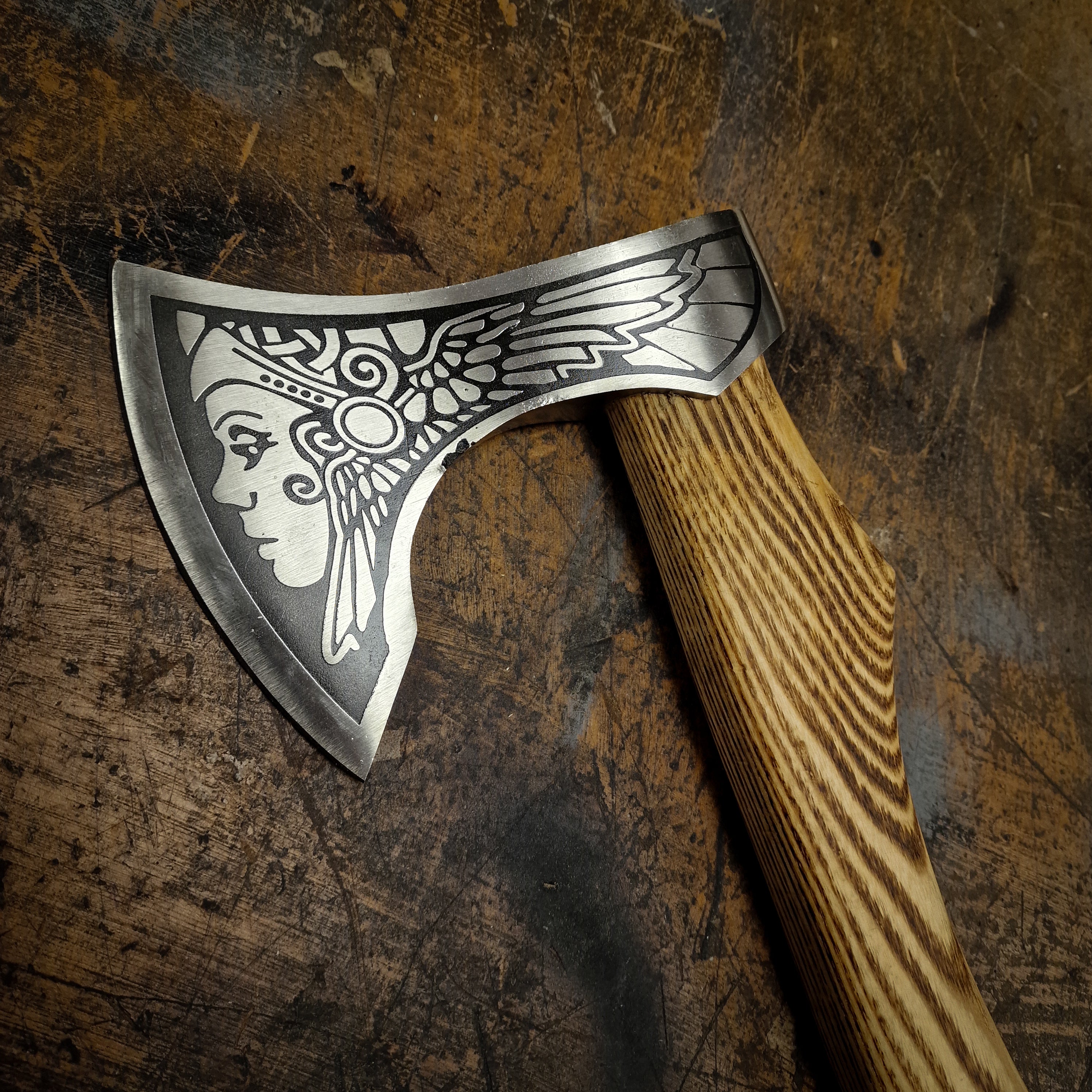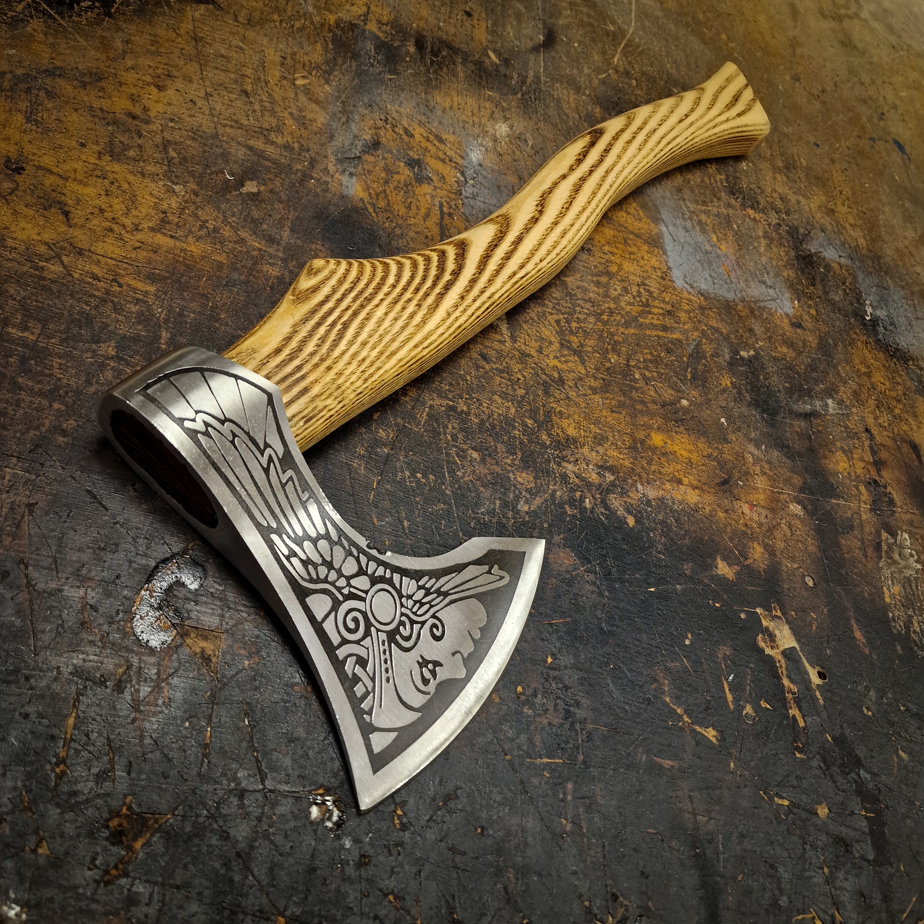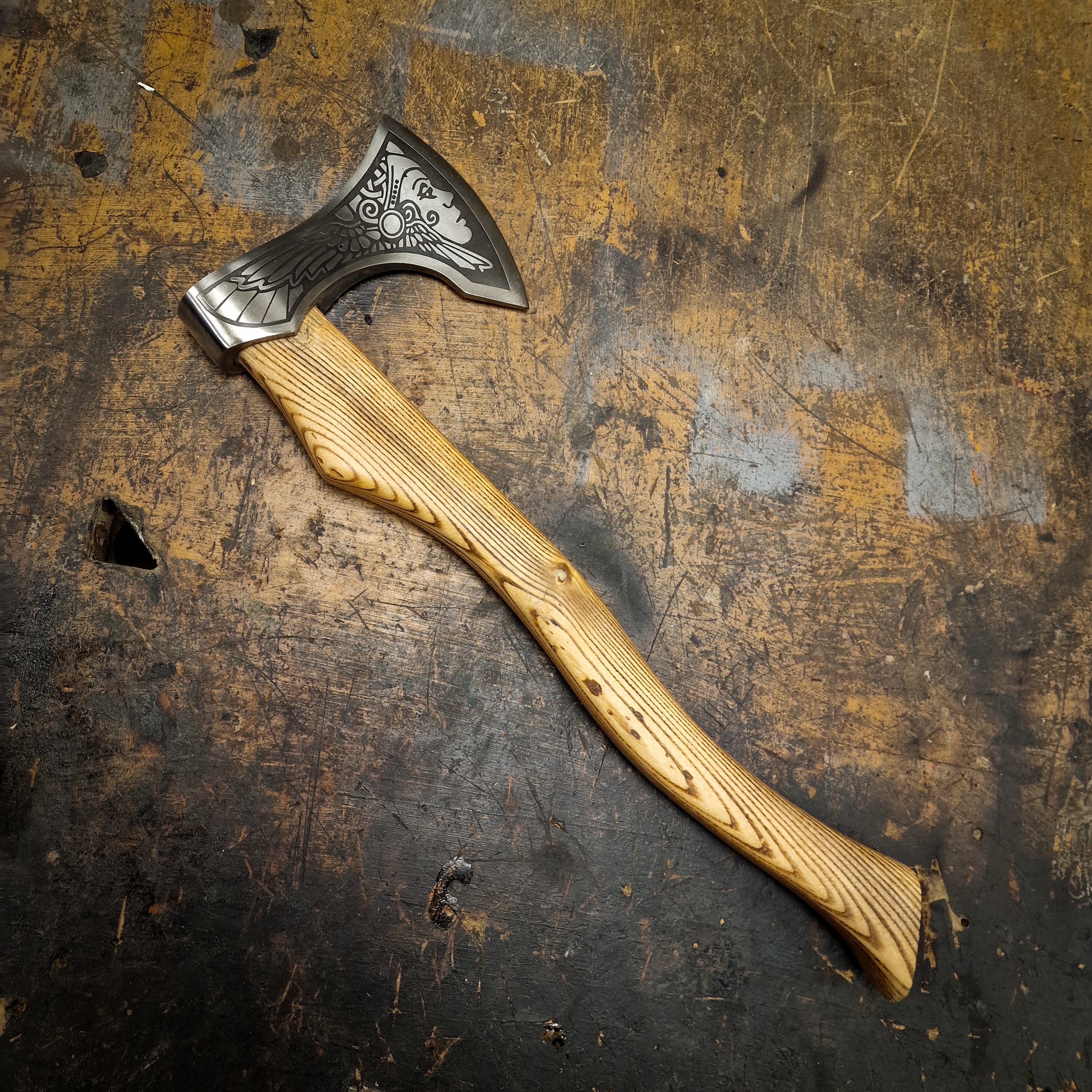 This axe features a high carbon steel sharp head, acid-etched Valkyrie design. The ash haft is part charred and waxed to bring out the depth and warmth of the grain whilst giving a high contrast finish. The Valkyrie is keen and durable; a maiden to be depended upon.