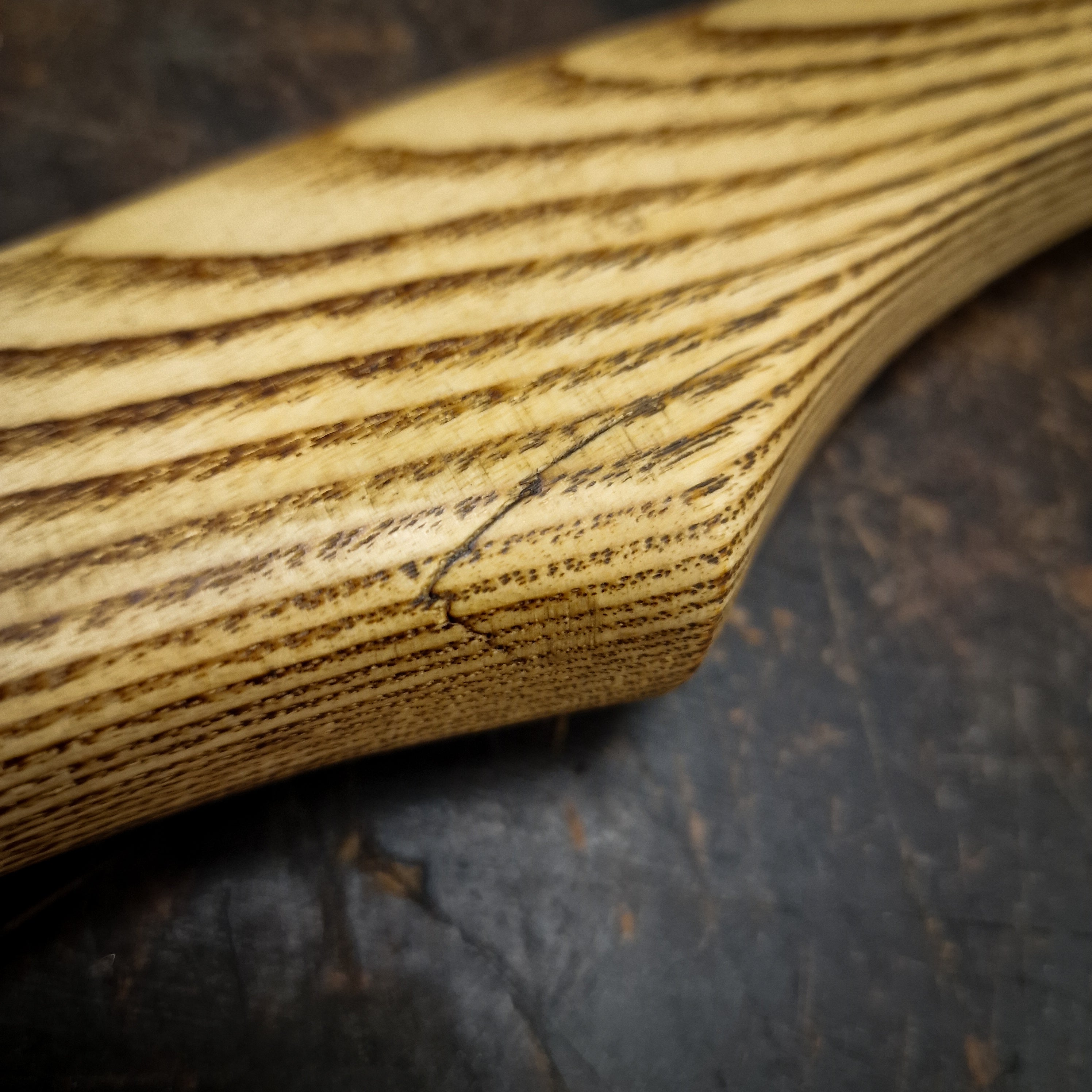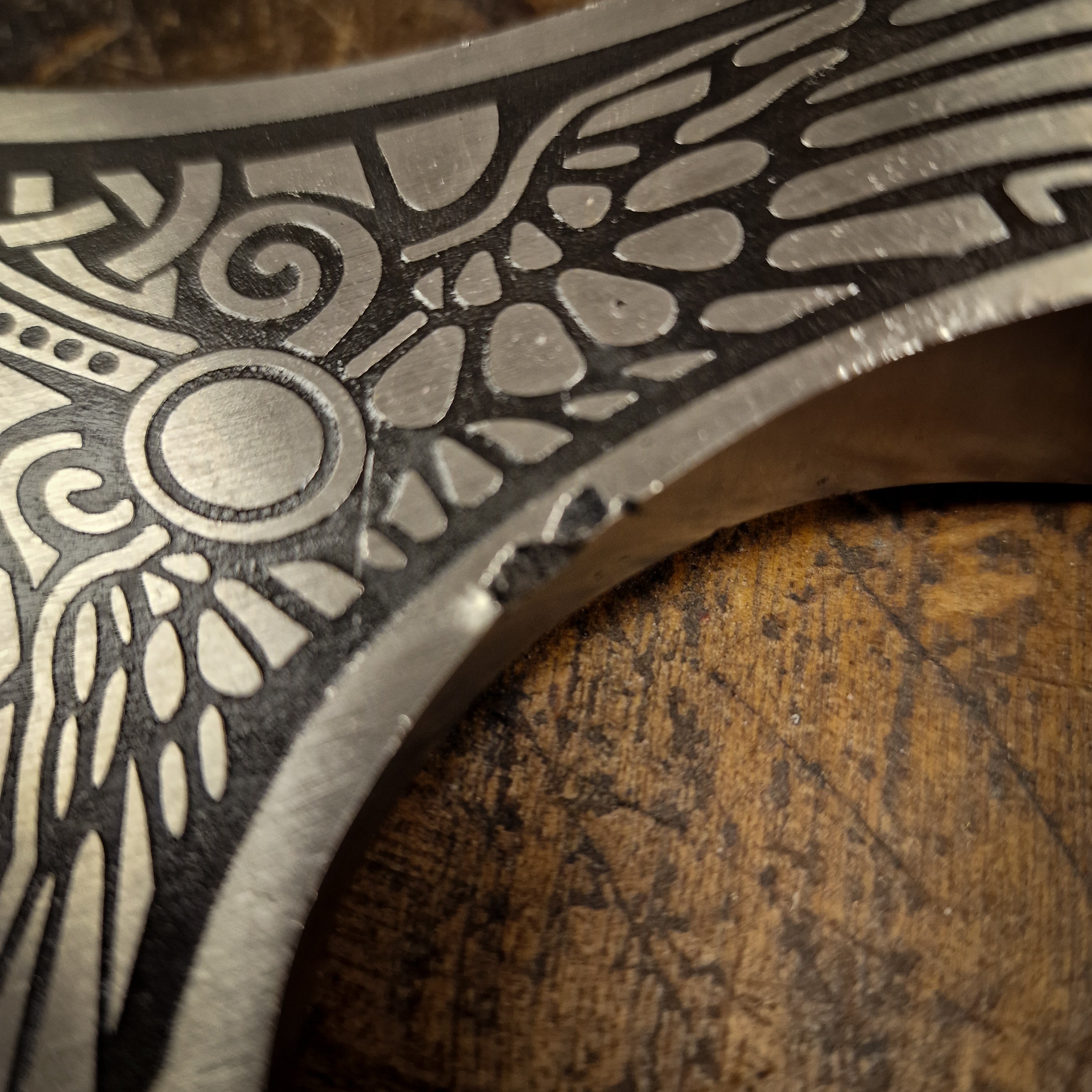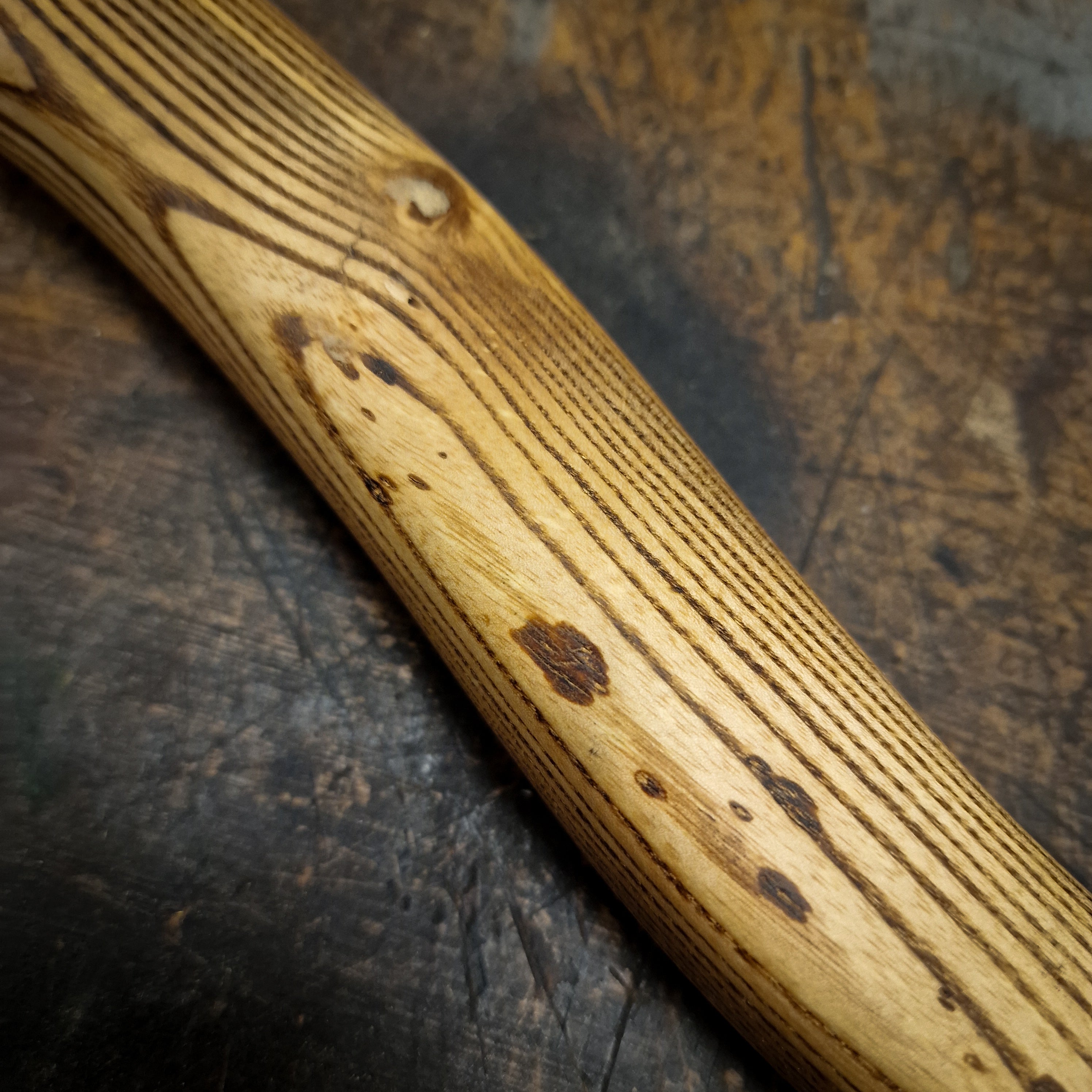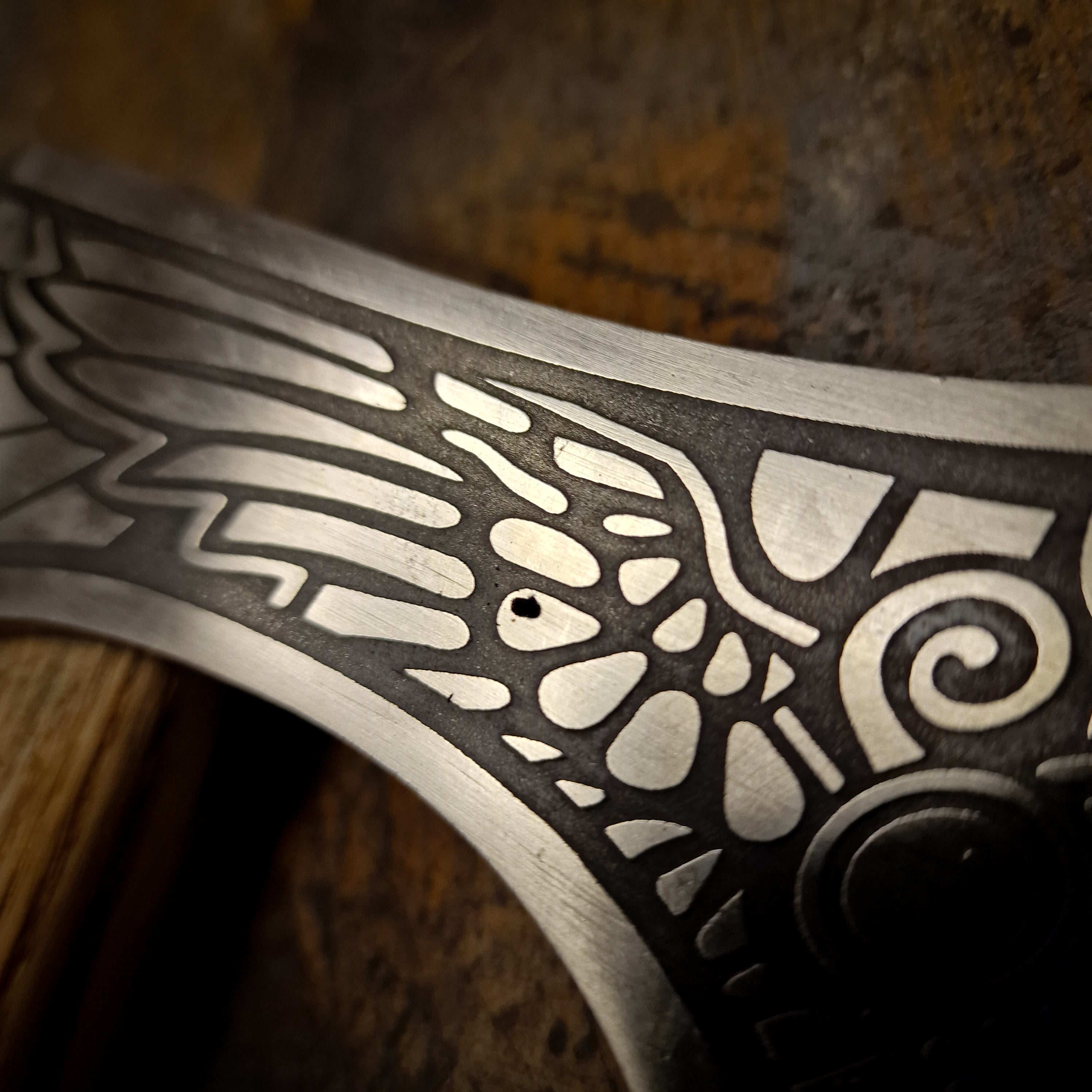This axe features a high carbon steel sharp head, acid-etched Valkyrie design. The ash haft is part charred and waxed to bring out the depth and warmth of the grain whilst giving a high contrast finish. The Valkyrie is keen and durable; a maiden to be depended upon.