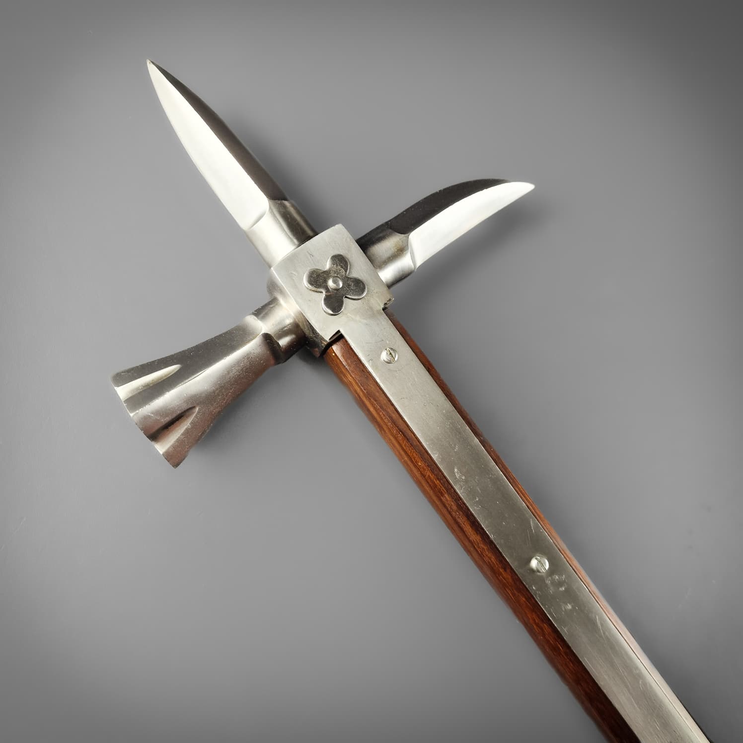 Every inch of this hammer speaks of craftsmanship and intent. The solid steel head features a blunt striking face for crushing blows, paired with a wickedly curved beak designed to pierce plate and shatter mail. In addition to this a vertical spike allowed the wielder to inflict damage from all angles. The polished wooden haft offers balance and control, giving its wielder both speed and devastating impact.
