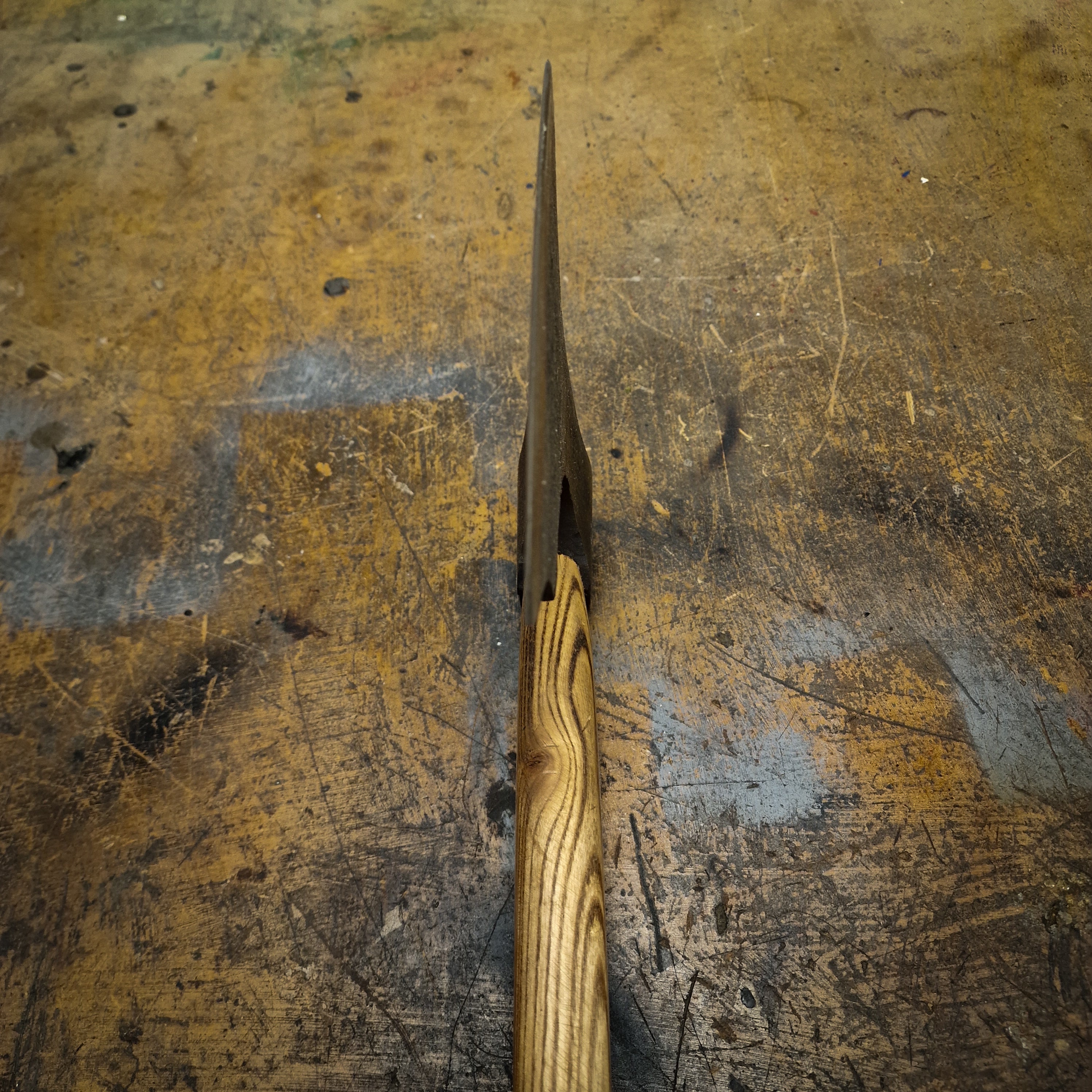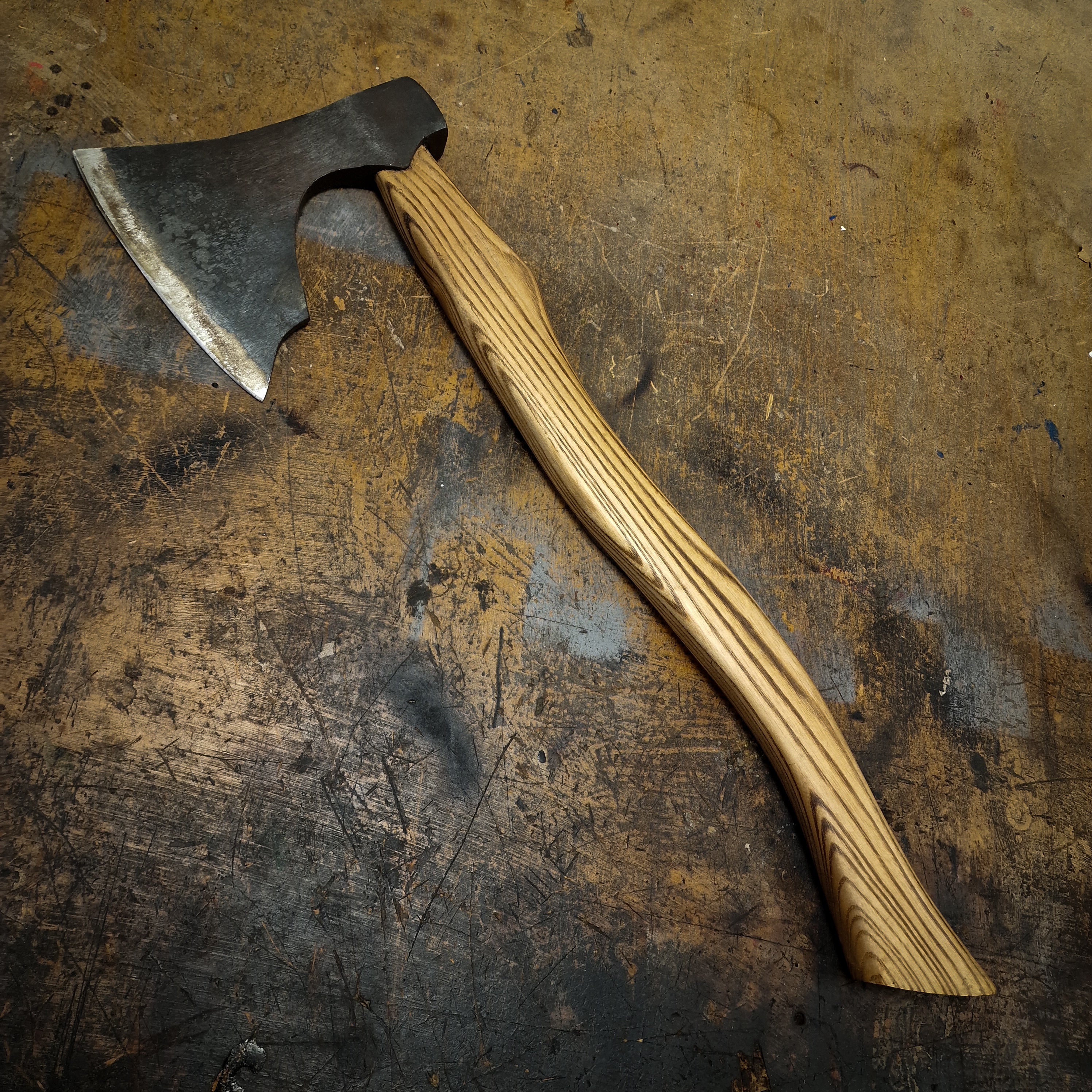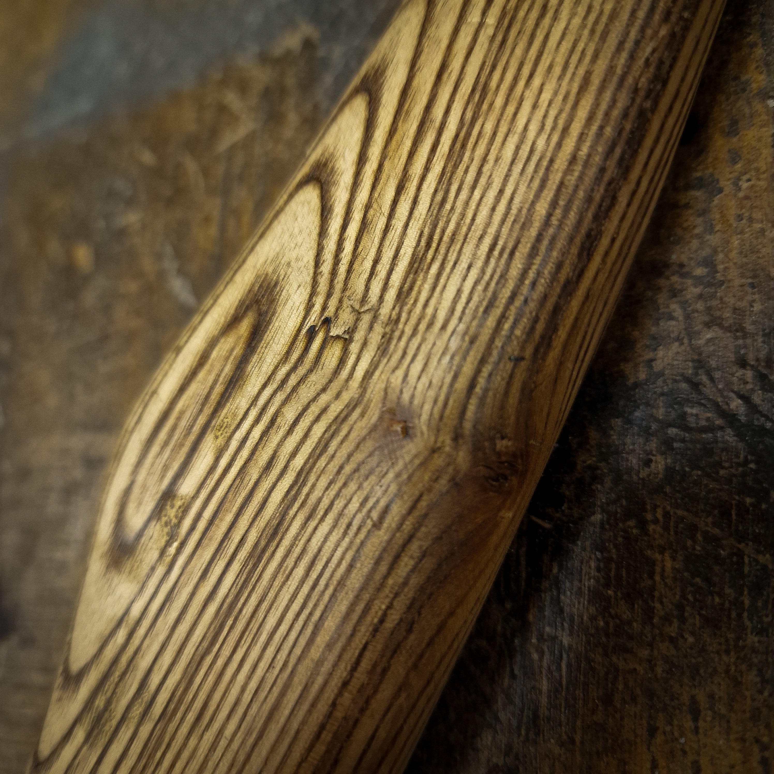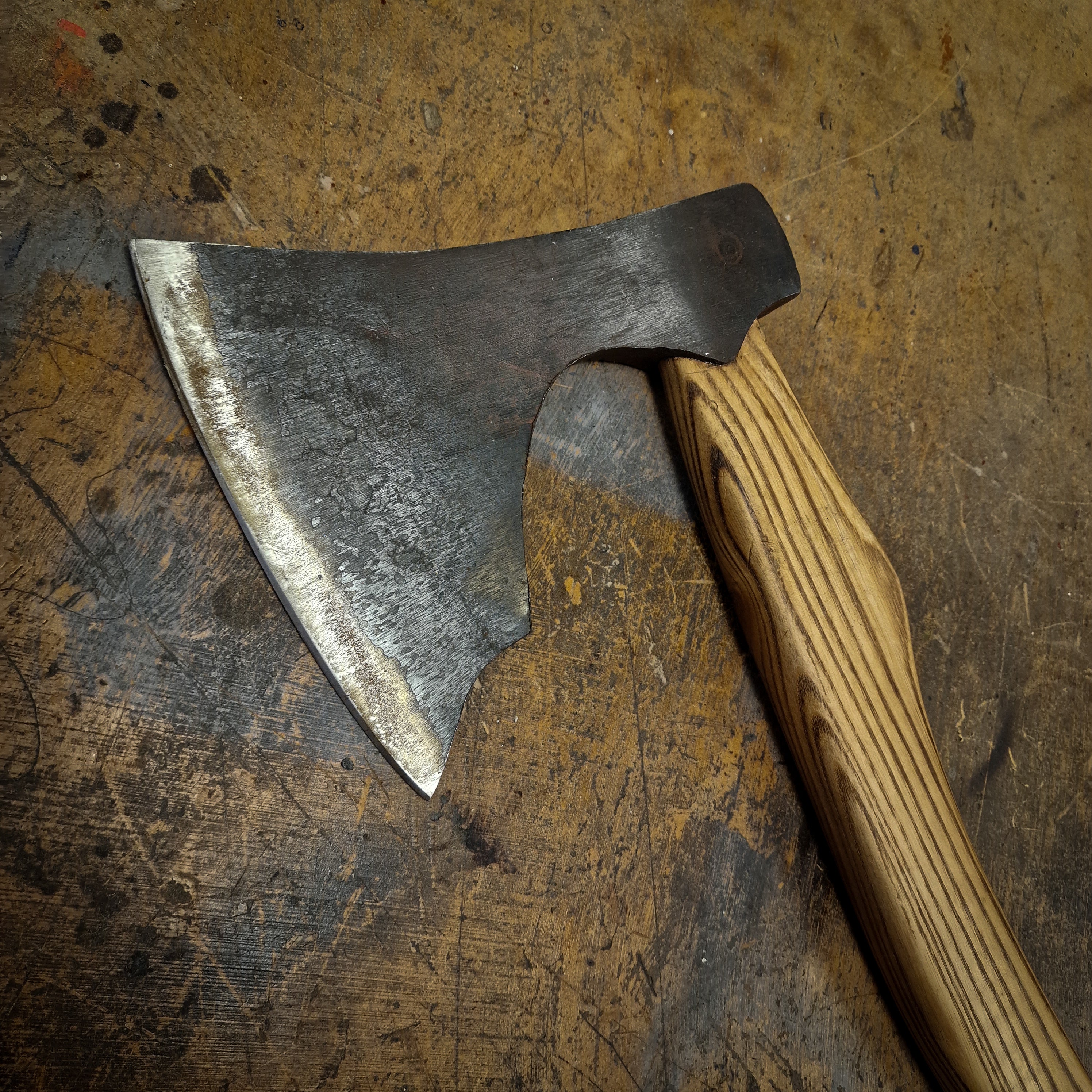 A blackened forged head with a polished blade edge leads to a fully charred and waxed haft, hand-burnt with bindrune representing might; it is created from the Warrior rune, Teiwaz, and the power rune, Uruz. This is one of our largest axes, and has two leather grips at the base and centre of the haft of black chunky leather. A real beast!