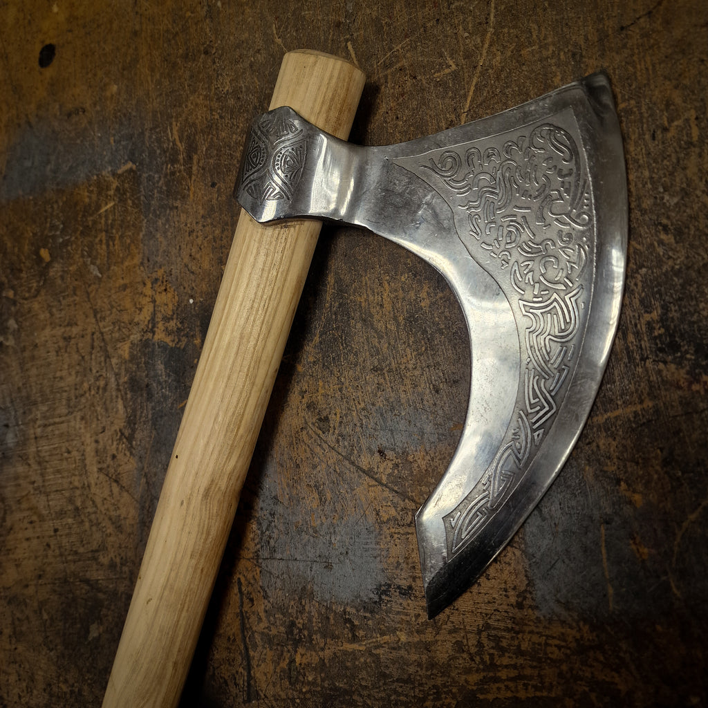 This large, bearded axe head is acid-etched with a Celtic-style design on the beard and shoulder.