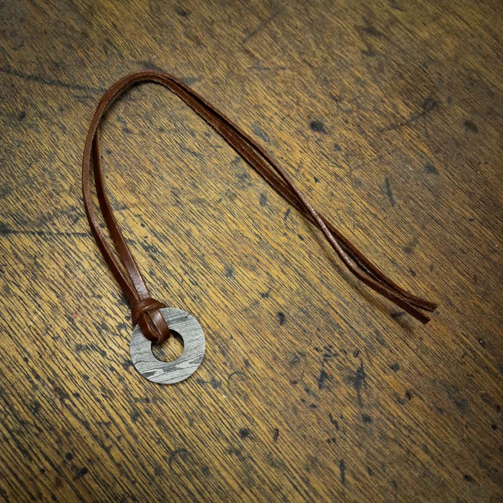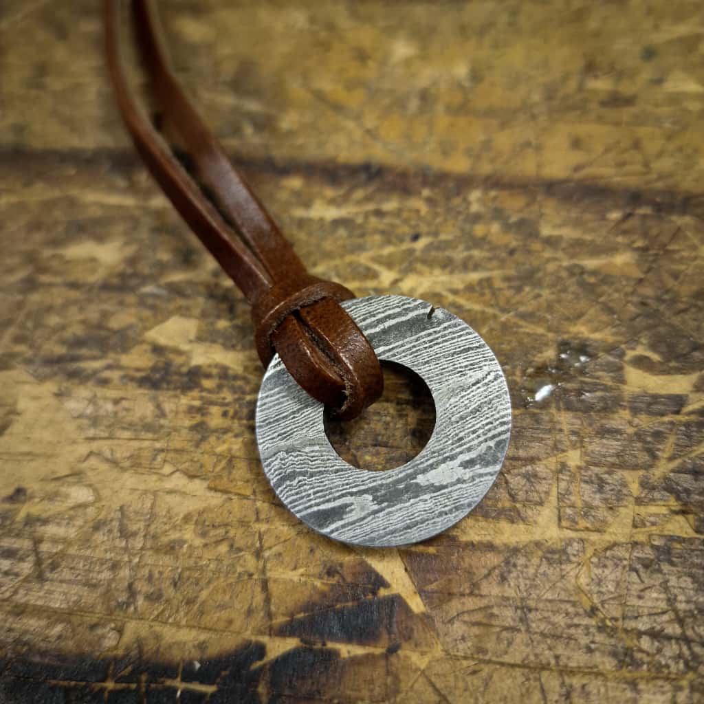 Here we have a circular Damascus pendant, each one has a cord that measures 29cm on each strand making it a little tight for a necklace. However they can be tied into a decent looking bracelet!