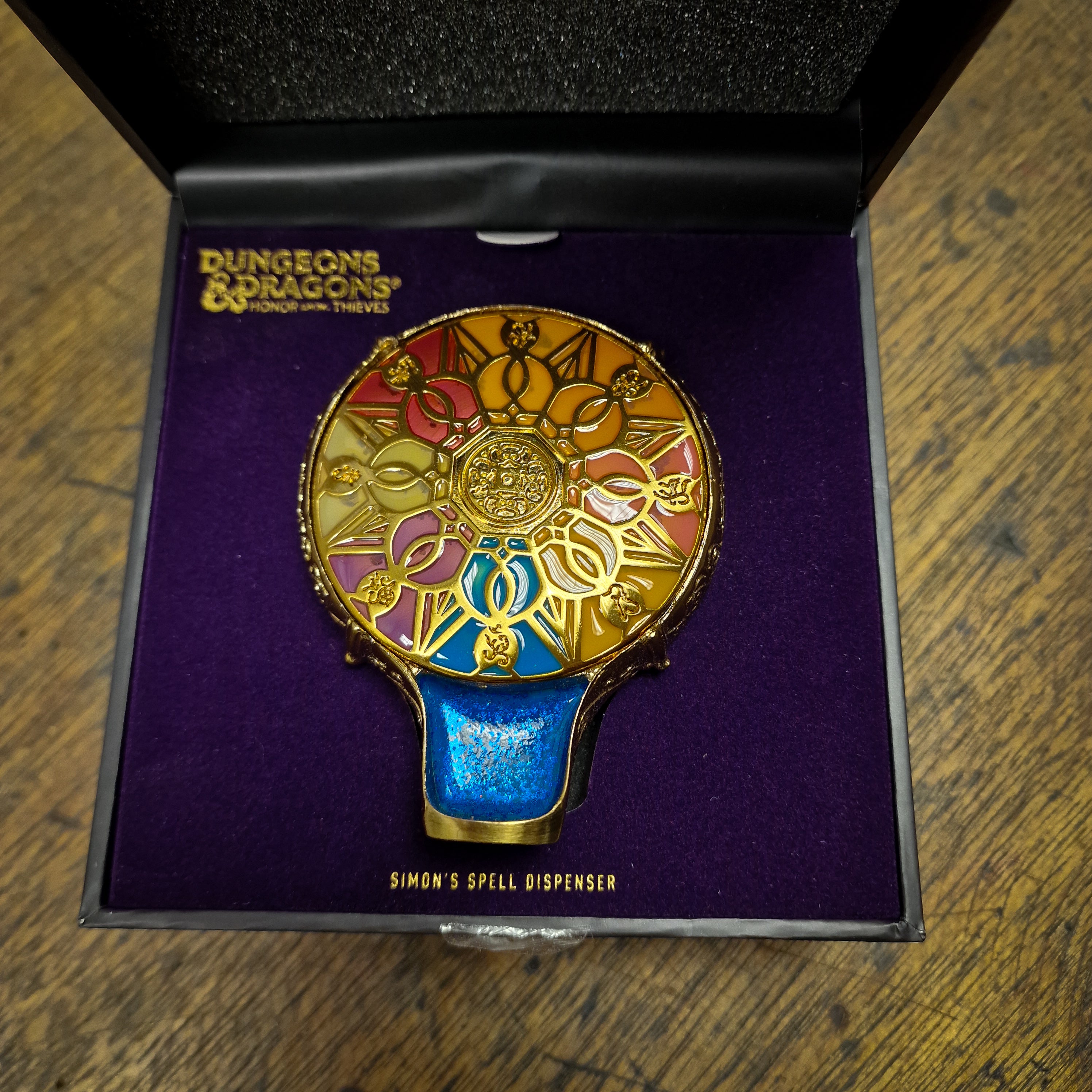 Summon the power of magic with this magnificent multi-colored Spell Dispenser replica. Cast spells on-the-go with ease, thanks to its wearable design. It's the perfect prop for any cosplay outfit or tabletop display. Whether you're a fan of the "Dungeons & Dragons" franchise or simply appreciate the artistry of movie props, Simon's Spell Dispenser is a must-have addition to your collection.