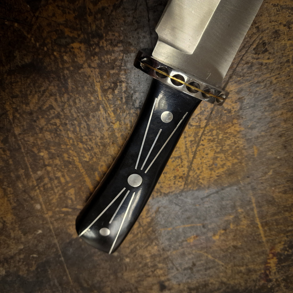 This large hunting knife has a tapered 440C blade, sharpened to a keen edge. The black wood and stainless steel handle features a unique geometric inlay design. The steel guard is designed to protect the hand from sliding up the blade as well as adding to the unique aesthetics, with a brass inlay running central. A fantastic knife that would make a fine addition to any collection.