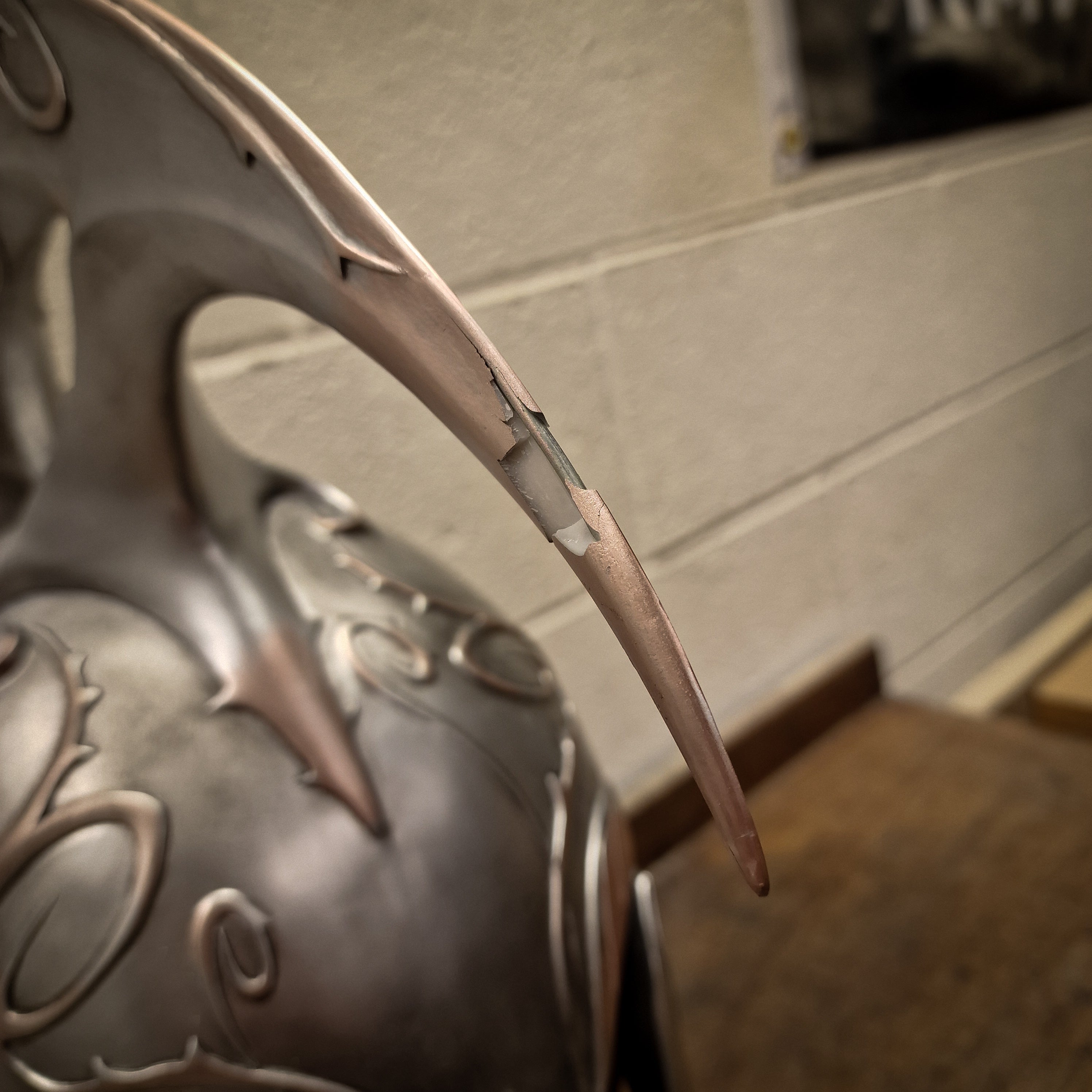 This item is in Clearance due to damage to the front spike of the helemt, please see pictures for details.