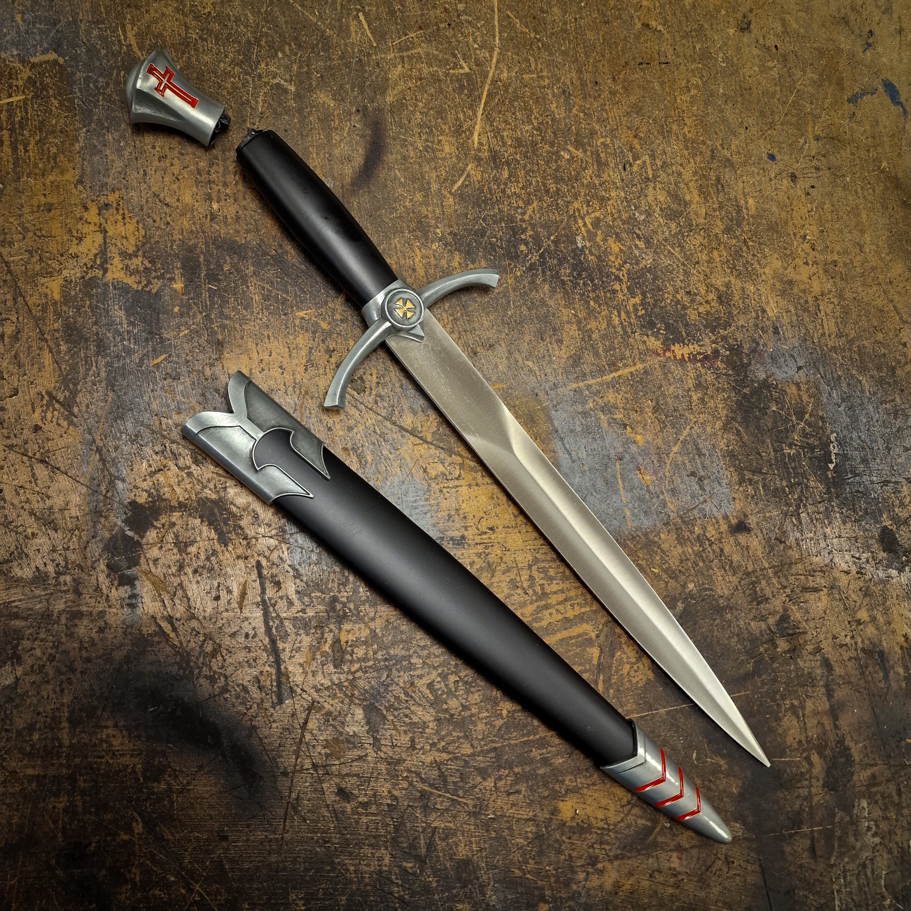 A large Templar dagger featuring a tapered steel blade housed in an impressive black scabbard with nickel detailing and red filled tip. The hilt features a nickel-finished gold Templar cross pommel and a scent-stopped style pommel featuring the red Templar cross. A fantastic addition to any collection.