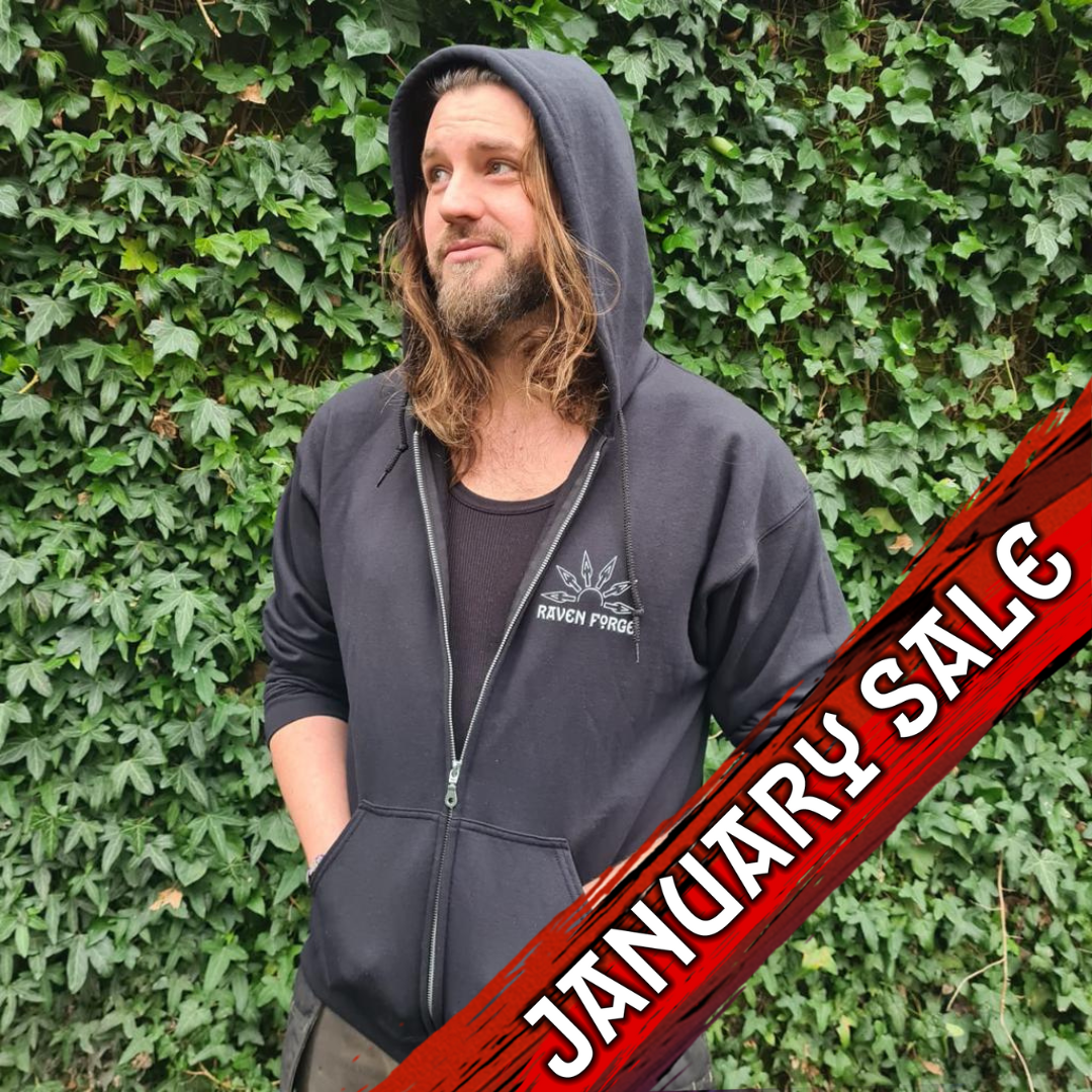 Our Old Ways hoodies are printed on a quality heavy-cotton blend black zip hoodie with white screenprint, with inclusive sizing ranging from S up to 5XL. The print features the iconic Raven Forge fan of spears logo on the front, and a geometric Raven design spanning the back. Rep the Forge!
