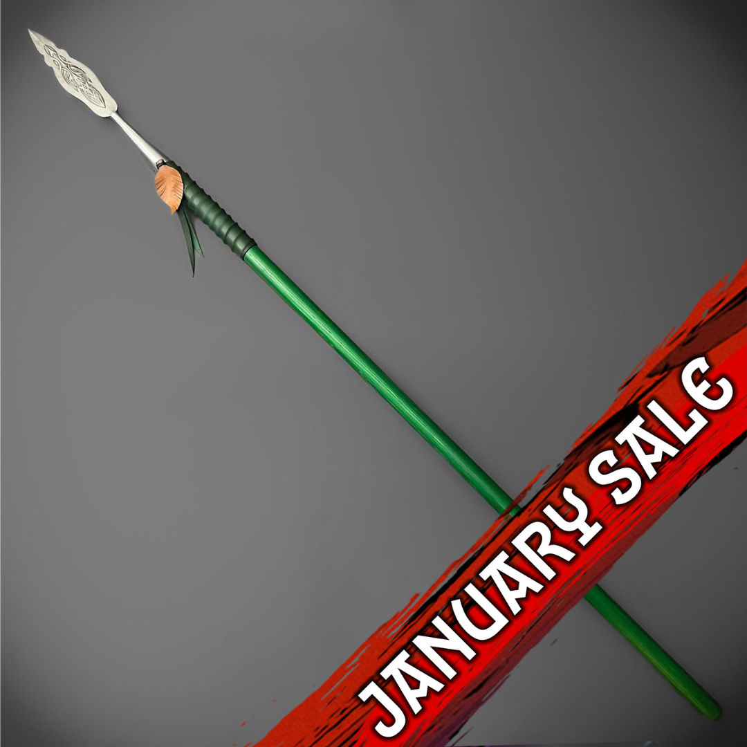 These Elven Spears have been crafted with inspiration taken from Elven folklore. They feature an intricately acid-etched spearhead and are hafted on green-stain English Ash. The haft is finished by hand-wrapping in green leather, with a handmade tan leather leaf.