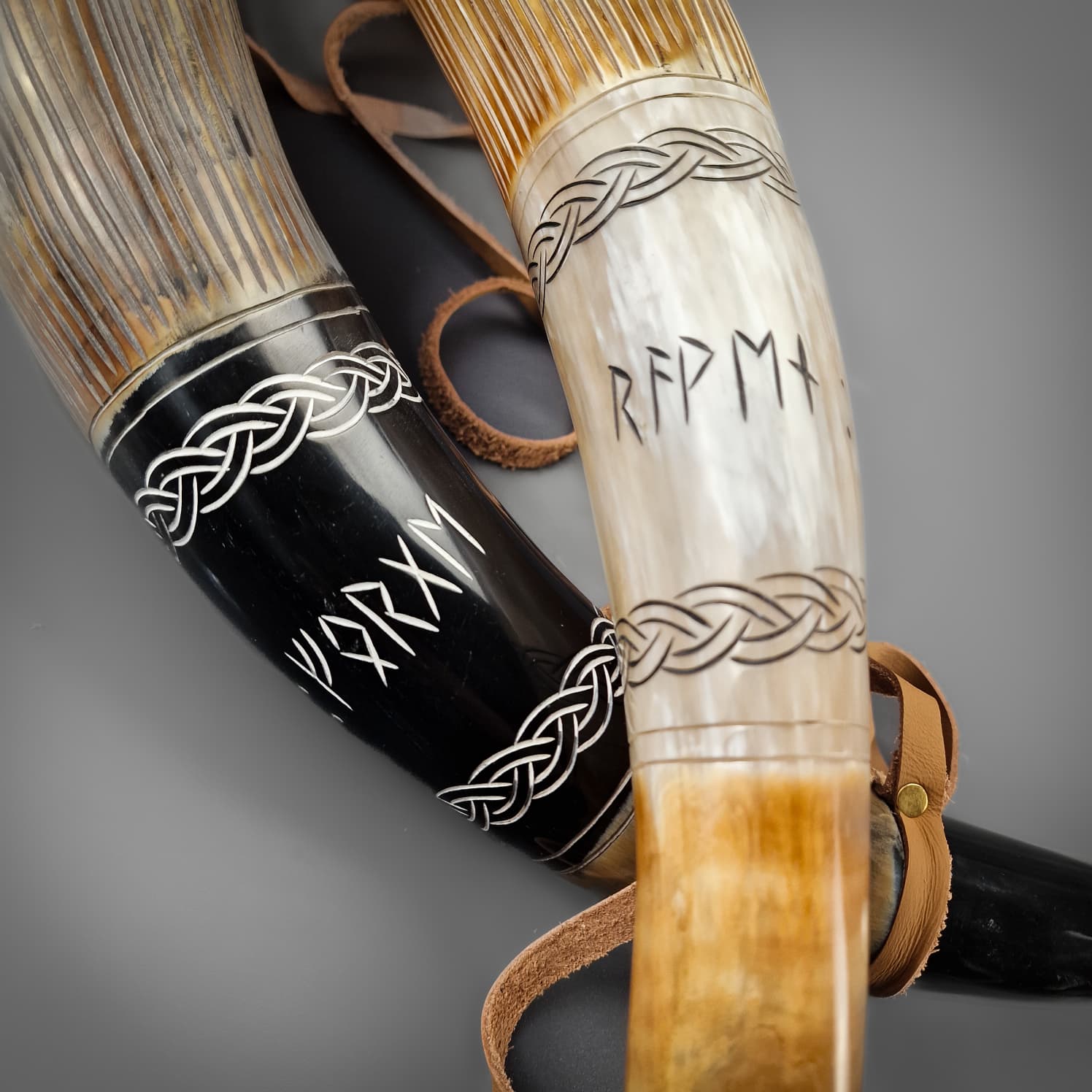These stunning war horns have been intricately hand carved with the Raven Forge name between two bands of knotwork pattern. A War Horn like that of Heimdall! Heimdall kept the Gjallarhorn, which could be heard throughout heaven, earth, and the lower world; it was believed that he would sound the horn to summon the gods when their enemies, the giants, drew near at the Ragnarök, the end of the world of gods and men.