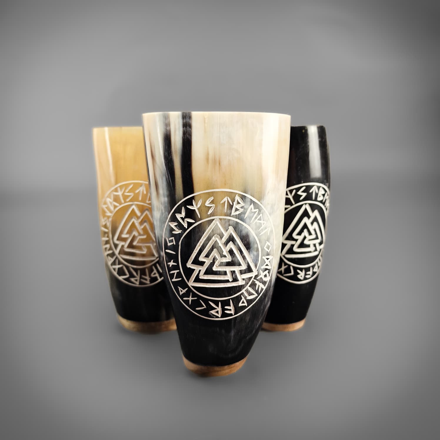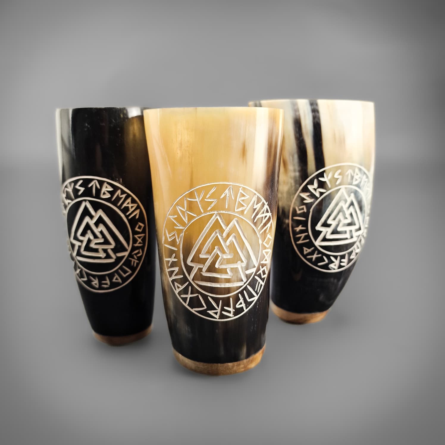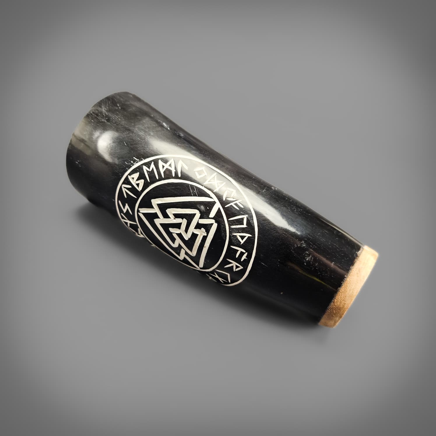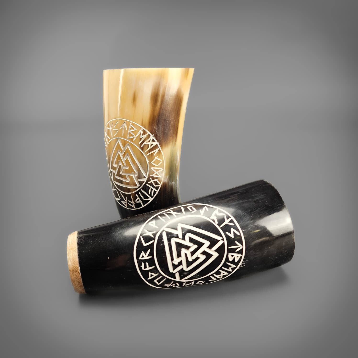 This horn mug is expertly crafted and polished. The interior is sealed with resin for the best drinking experience, and to prevent damage to the horn. Hand engraved with a Valknut Rune!