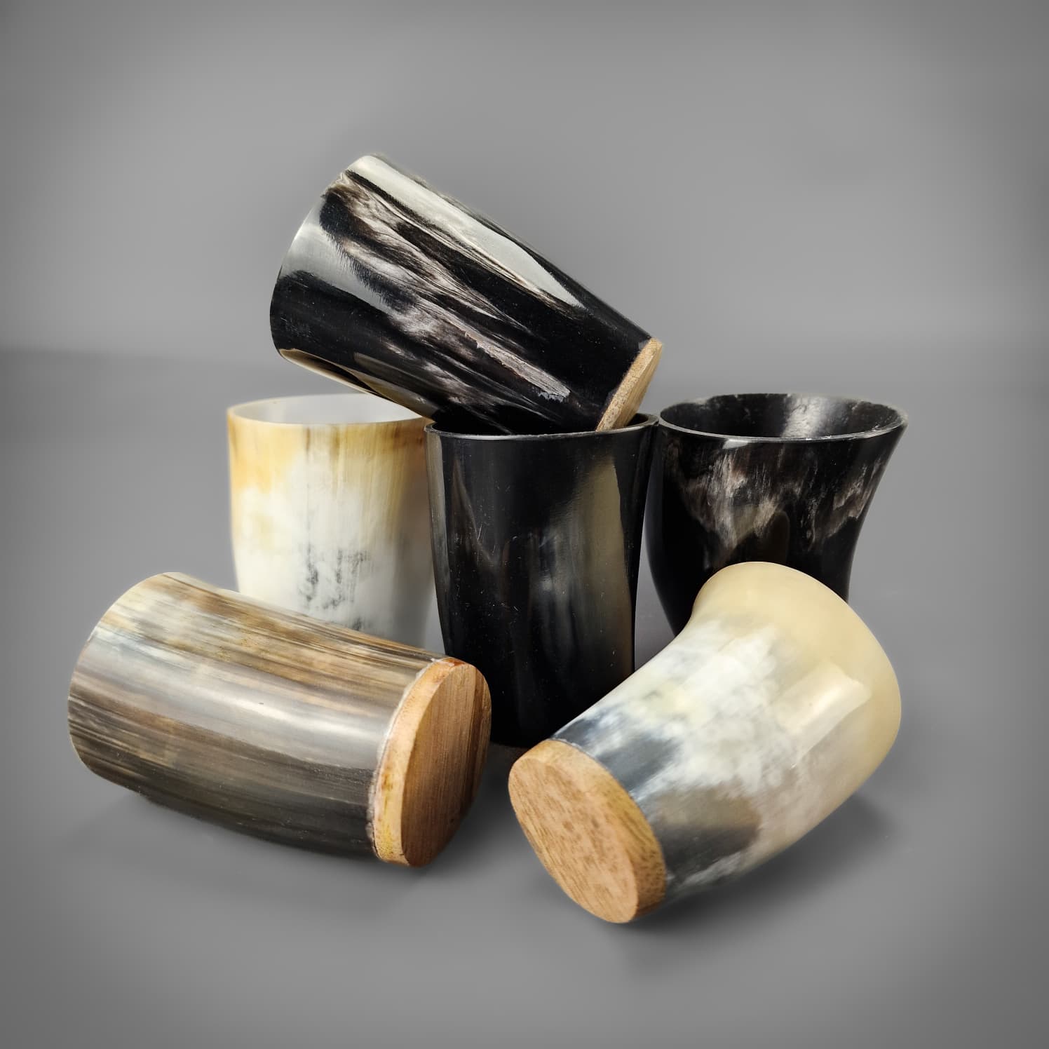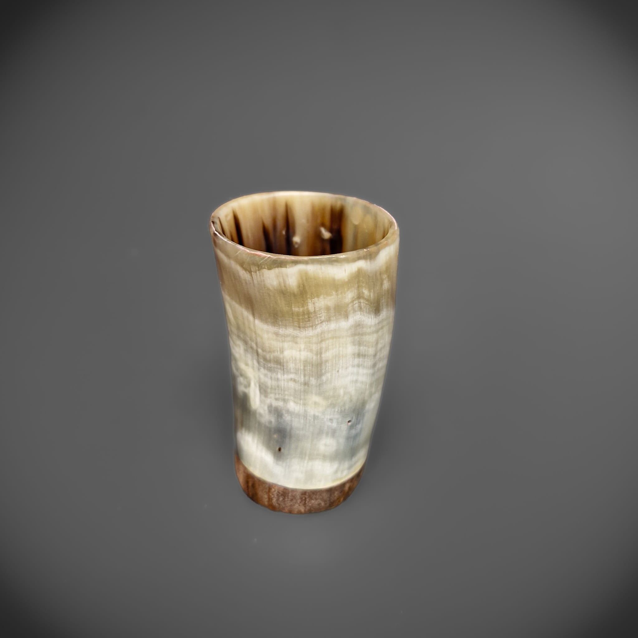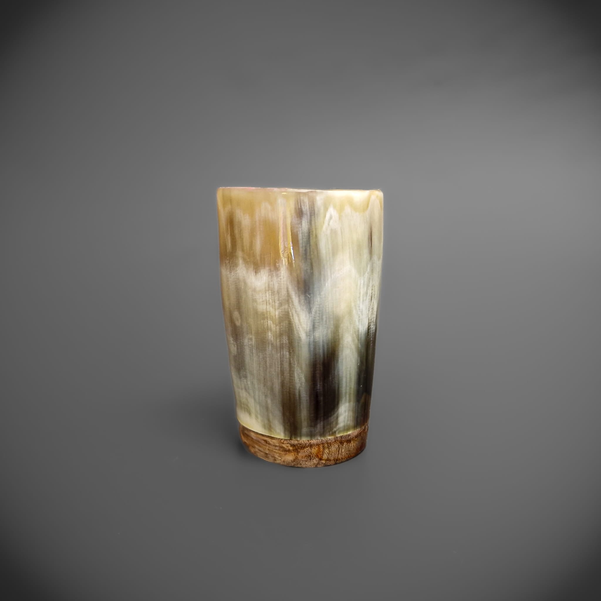 This is a beautifully polished horn shot glass with a natural finish and a wooden base. The interior is sealed with resin for the best drinking experience, and to prevent damage to the horn.