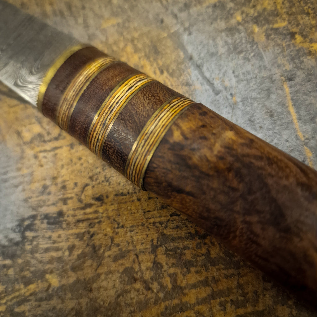 This Birka seax is brilliant. The Blade is tight Damascus pattern steel with a sudden broken-back seax shape. This leads to a segment of brass and wood rings creating an intricate patterns and a hardwood grip, sandwiched between 2 brass bolsters.