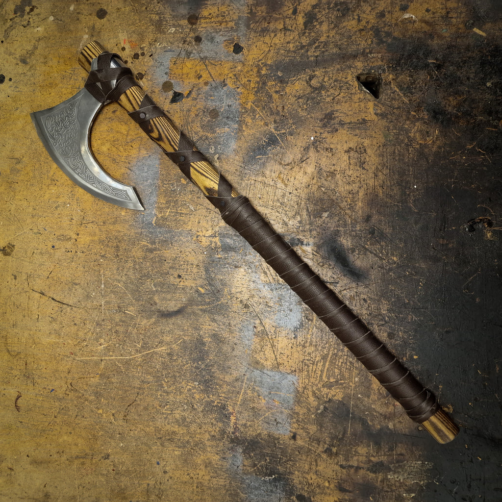 This large, bearded axe head is acid-etched with a Celtic-style design on the beard and shoulder.