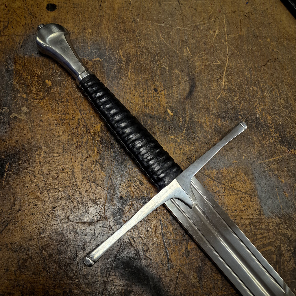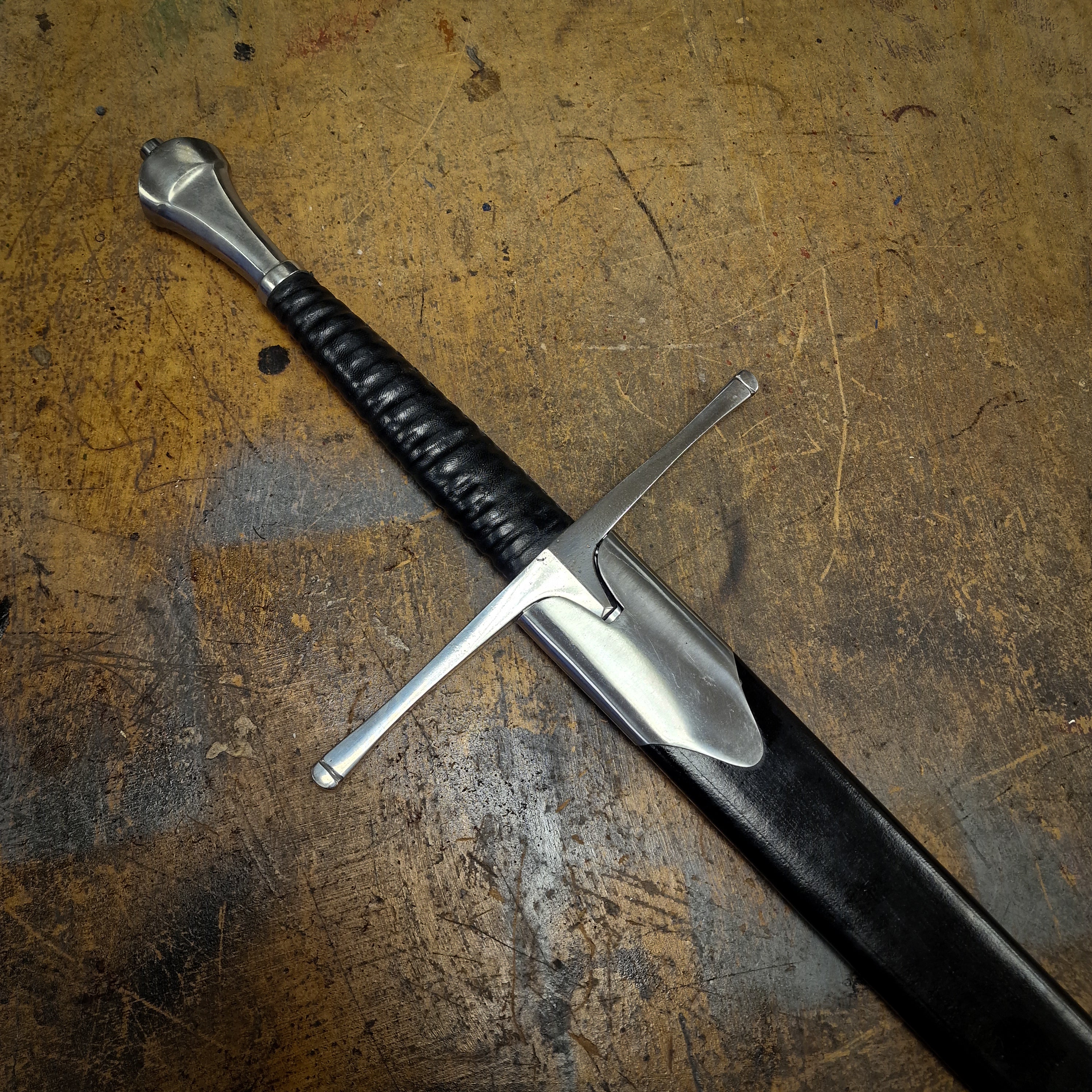 This spectacular example features a scent-stopper pommel, a leather wrapped wooden handle and a large central fuller flanked by two additional fullers that run the length of the ricasso, giving the blade excellent balance and weight distribution. Complete with a leather scabbard with steel mount and chape, this absolute beauty is everything a sword should be.