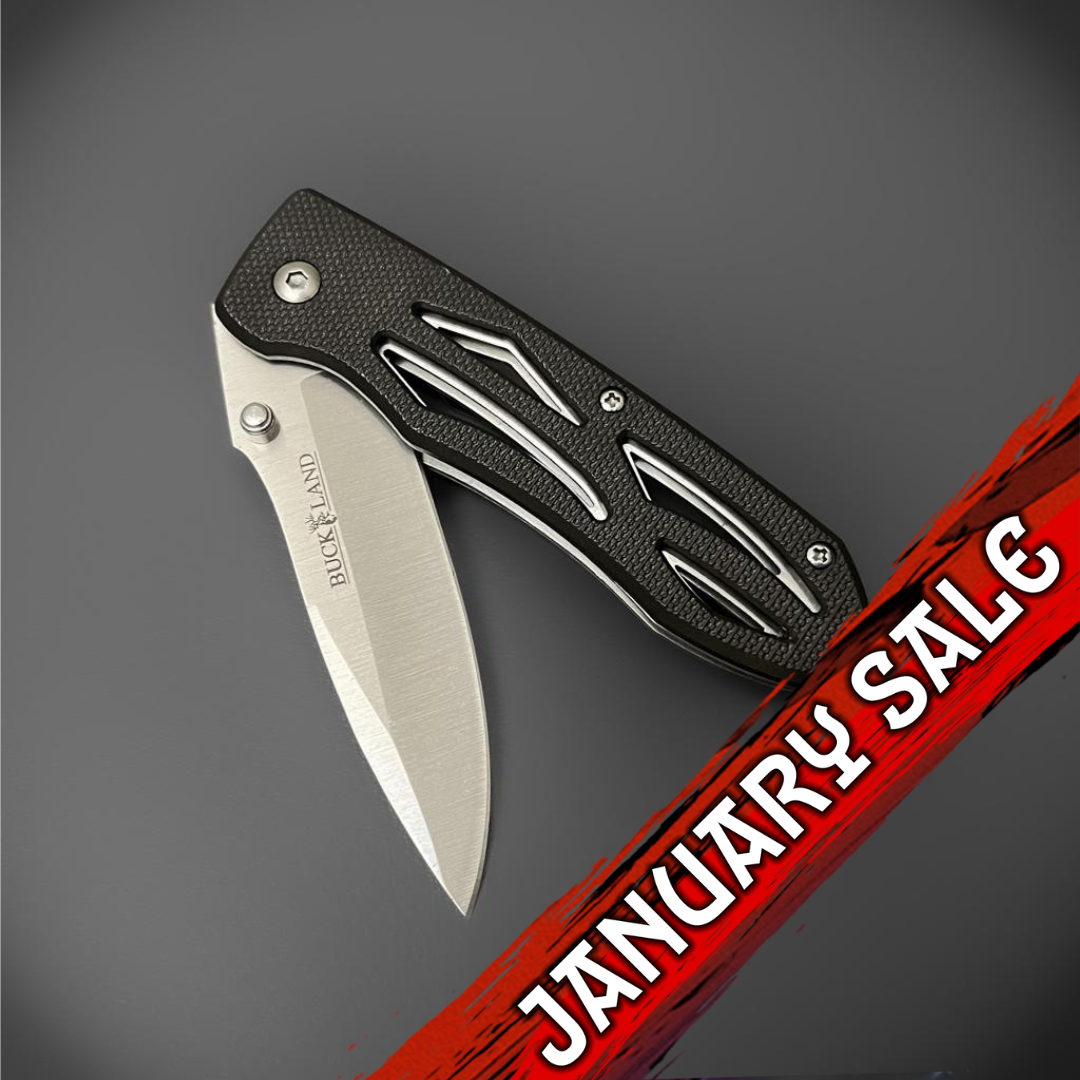 A locking & folding stainless steel knife, sharpened to keen edge. Featuring an ergonomic and tactical black textured grip with steel belt clip, and aesthetic cut outs to show the blade profile beneath.