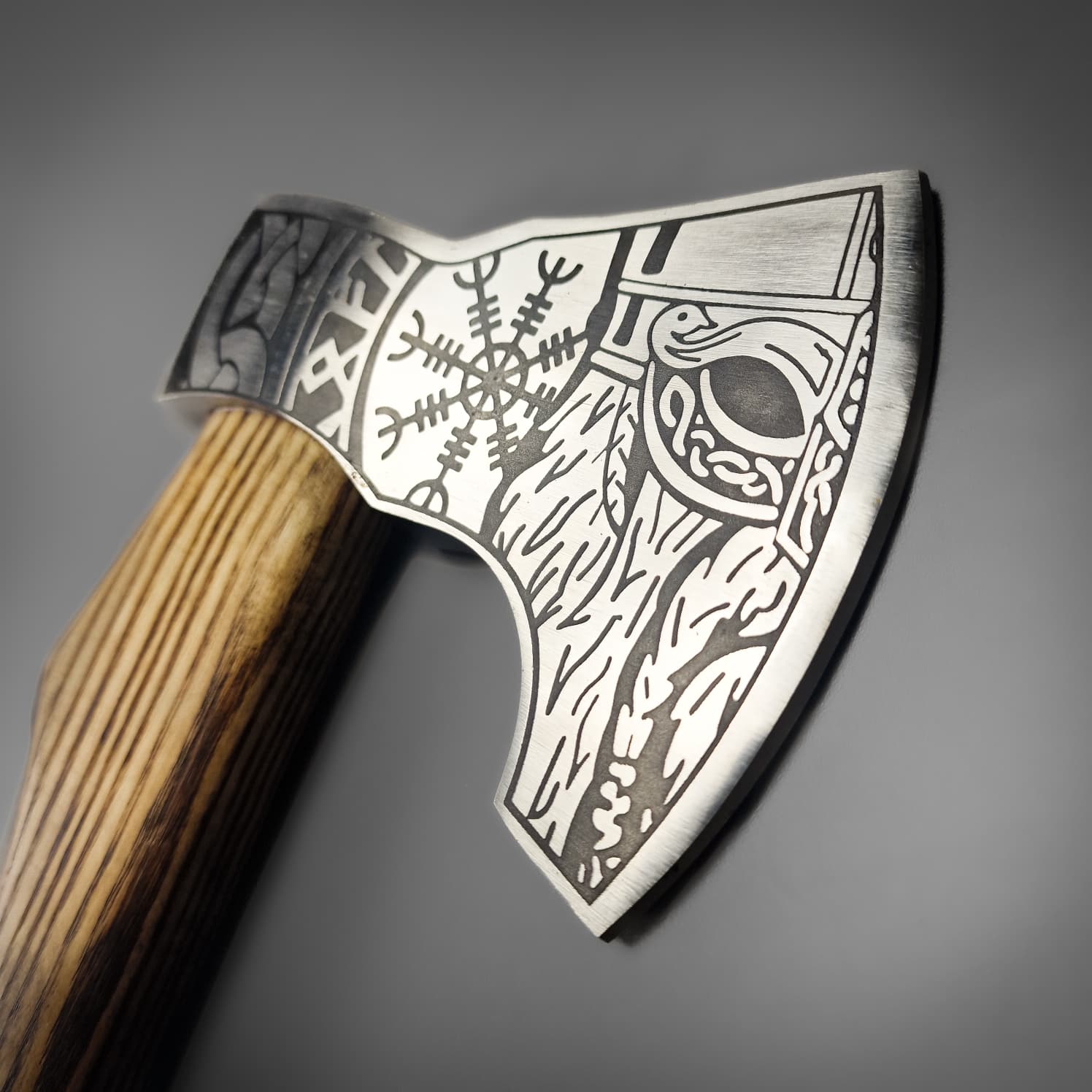 This bearded Viking axe is etched with a stunning Viking with some knot, rune and a helm of awe (we know, we know, its later in time but its pop culture at this point). The axe is a very durable high carbon steel, sharpened to an edge ideal for chopping. The head has been hafted on a 47cm half charred length of English Ash.