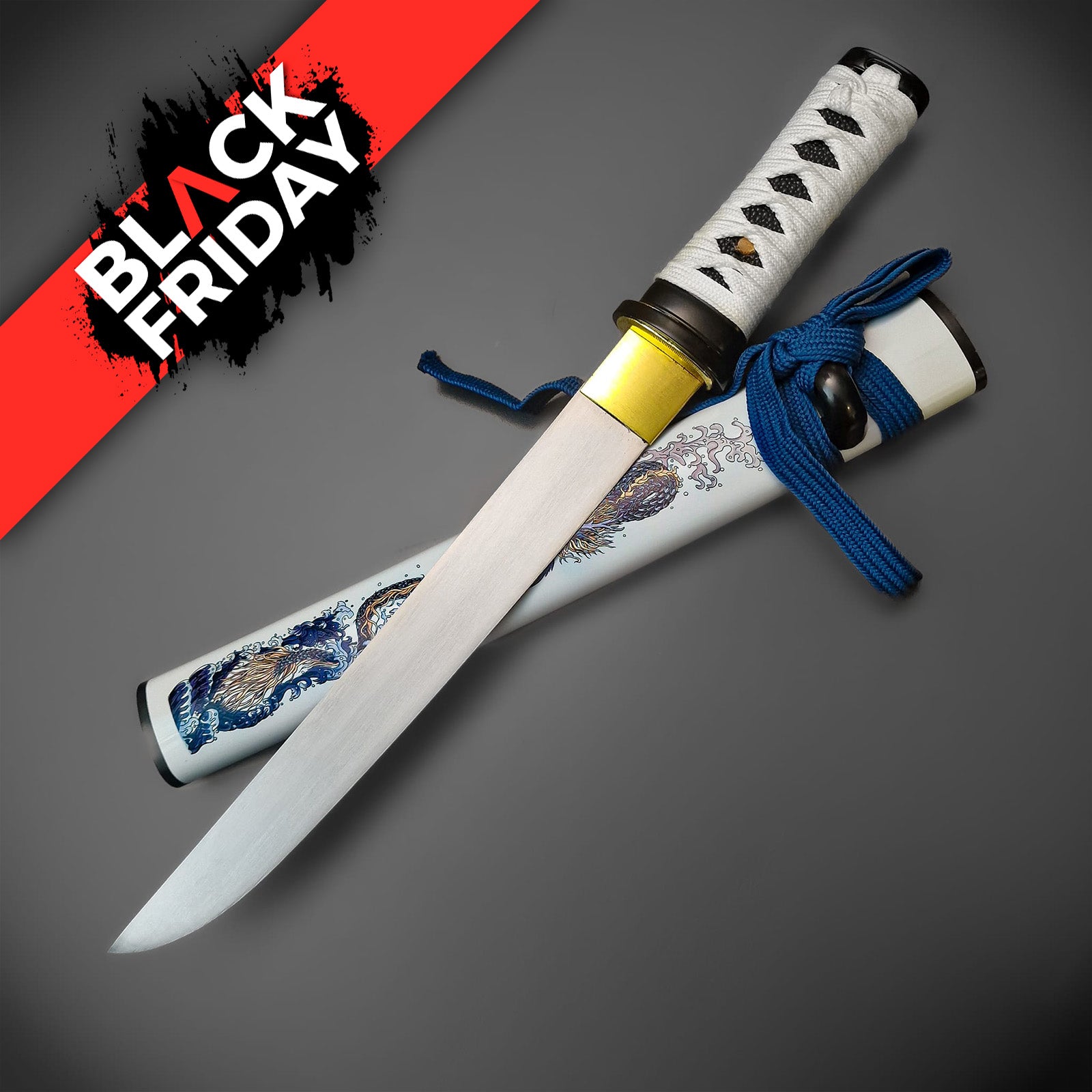 This fine example features a 1065 high carbon steel blade that ends in a sharp point, and a white saya (scabbard) with an image of Ryūjin, legendary Japanese dragon-god of the sea.
