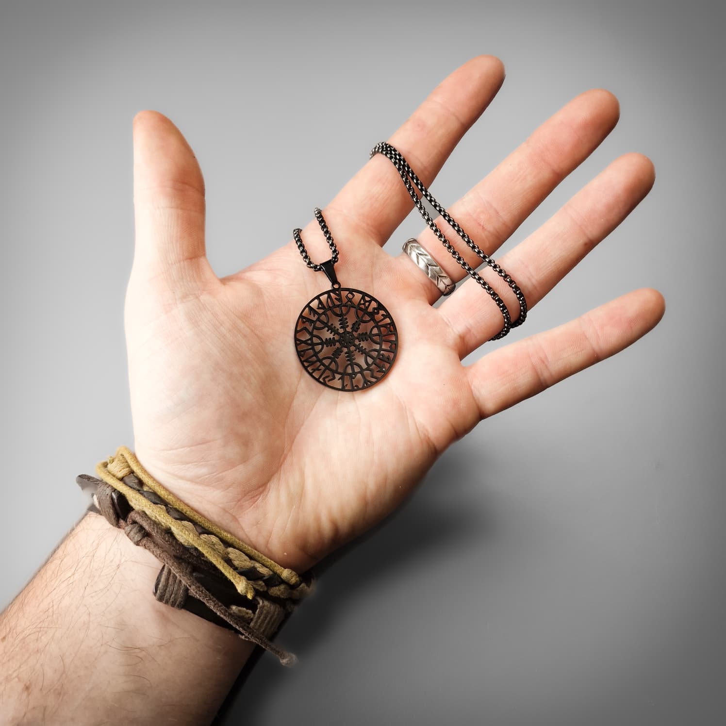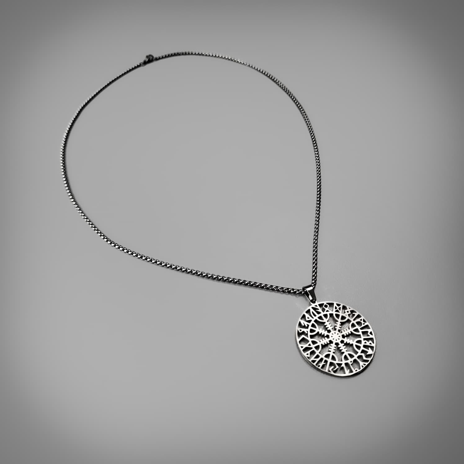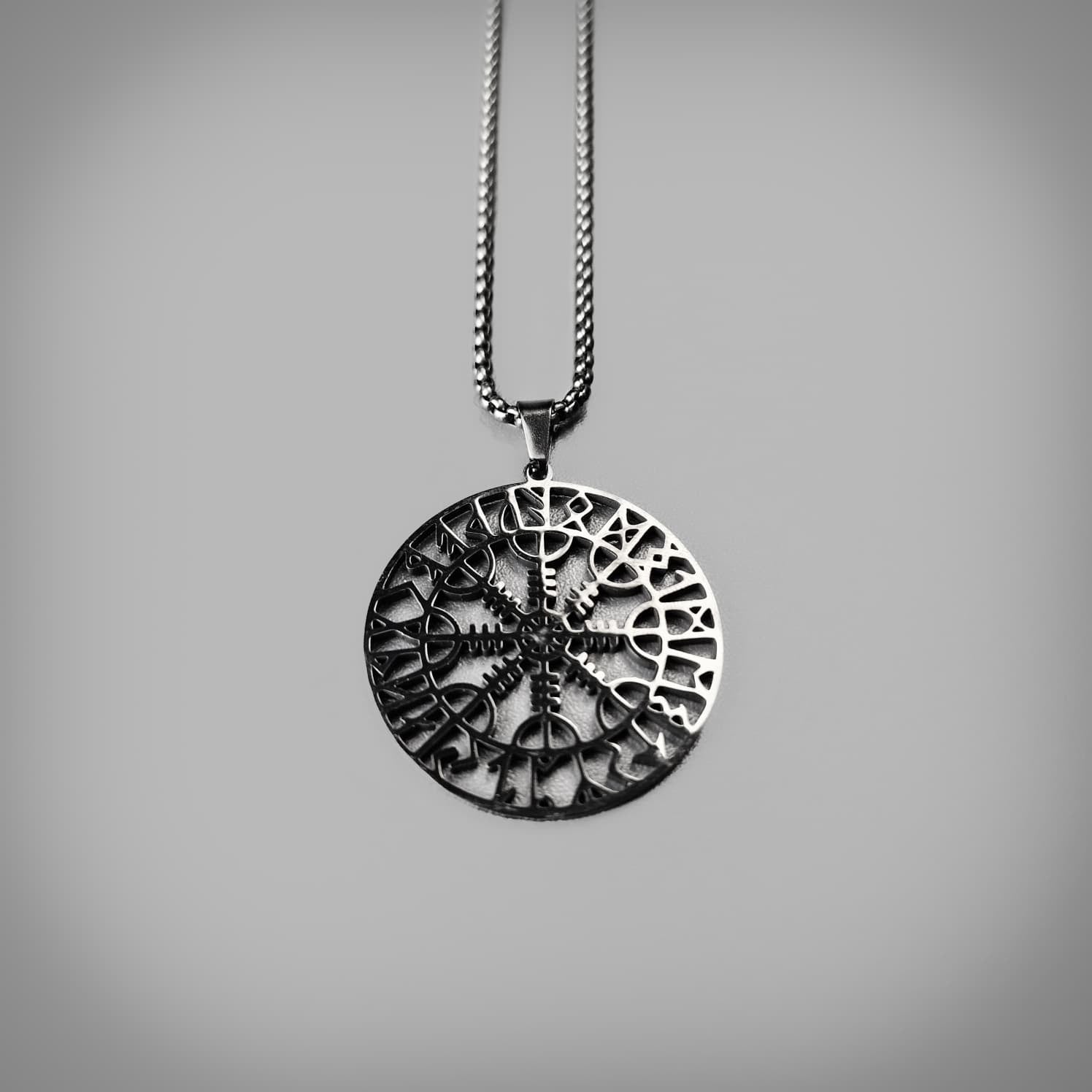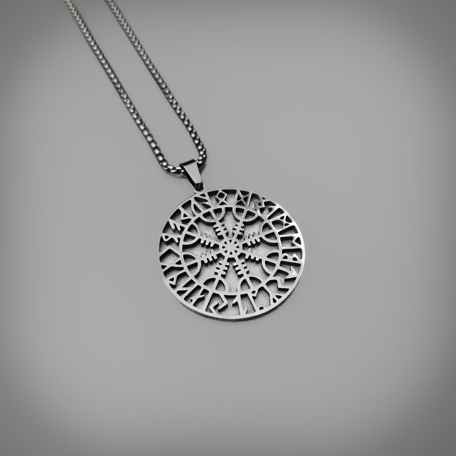 The Helm of Awe (Old Norse: Ægishjálmr) is a powerful Norse magical stave and symbol of protection, fearlessness, and victory, often featuring eight spiked tridents radiating from a centre point. This pendant features the symbol surrounded by a crest of Elder Futhark runes.