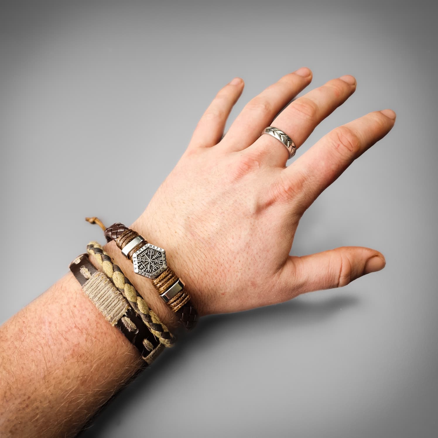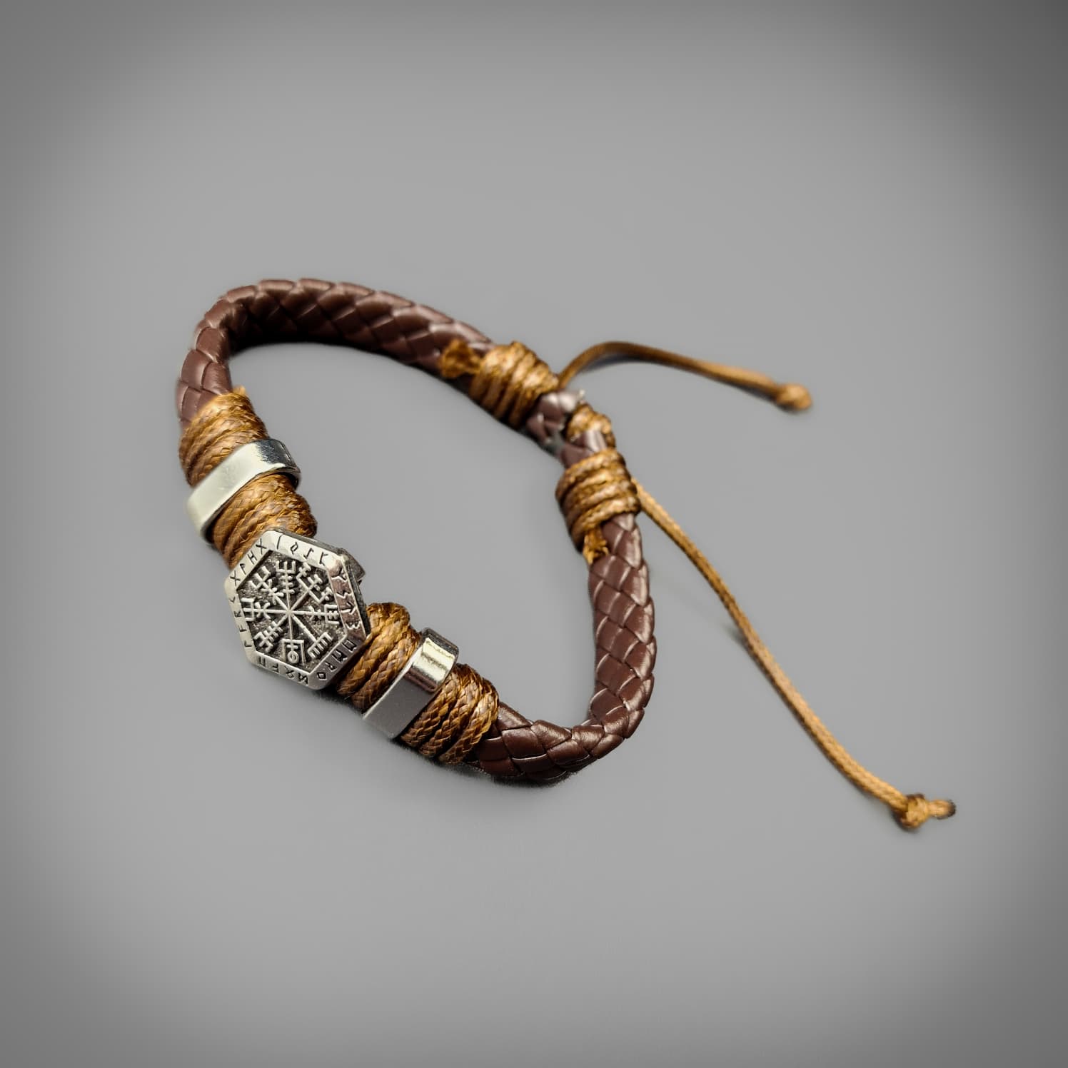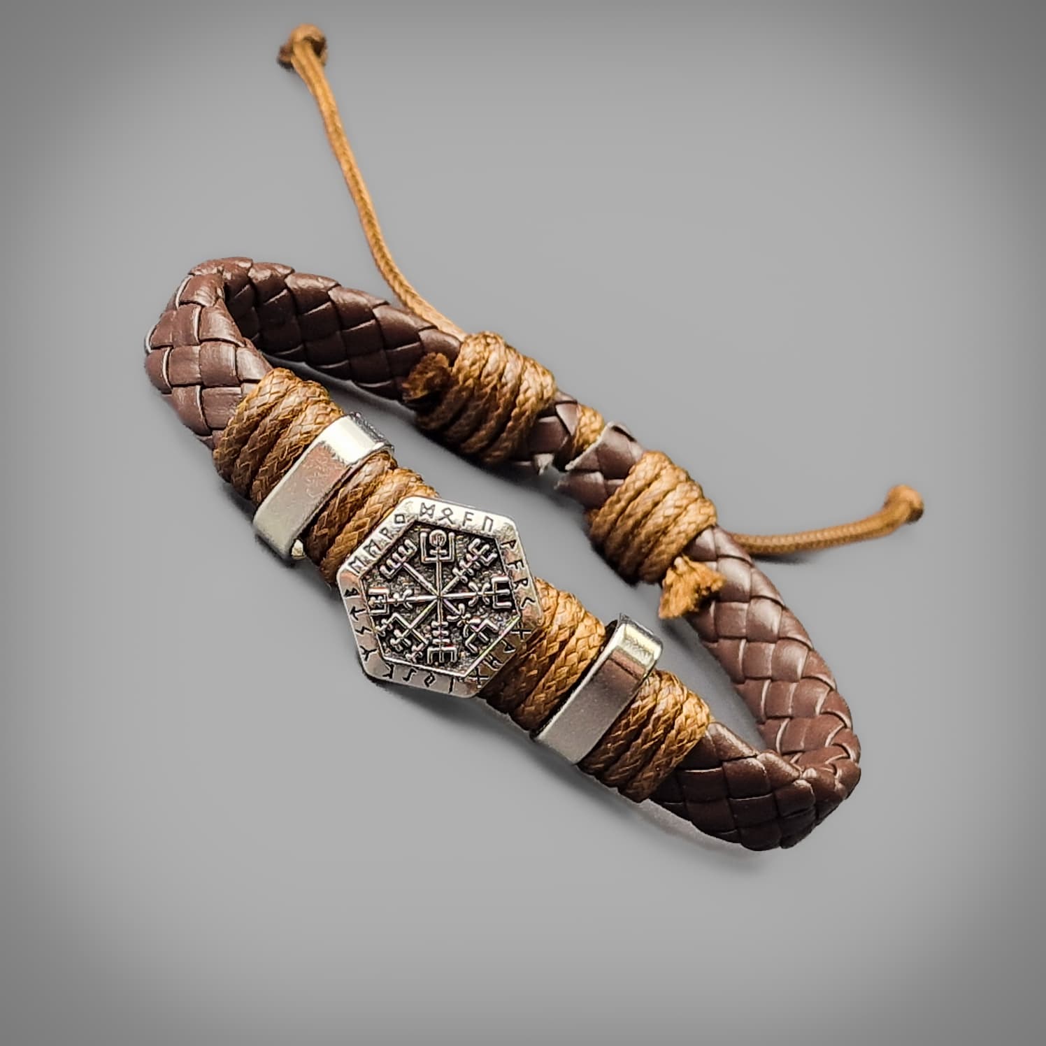 It is said that when sign of Vegvísir is carried, one will never lose one's way in storms or bad weather, even when the way is not known. The Vegvísir symbol on this wristband is surrounded by Elder Futhark Runes and fastens with a magnetic clasp