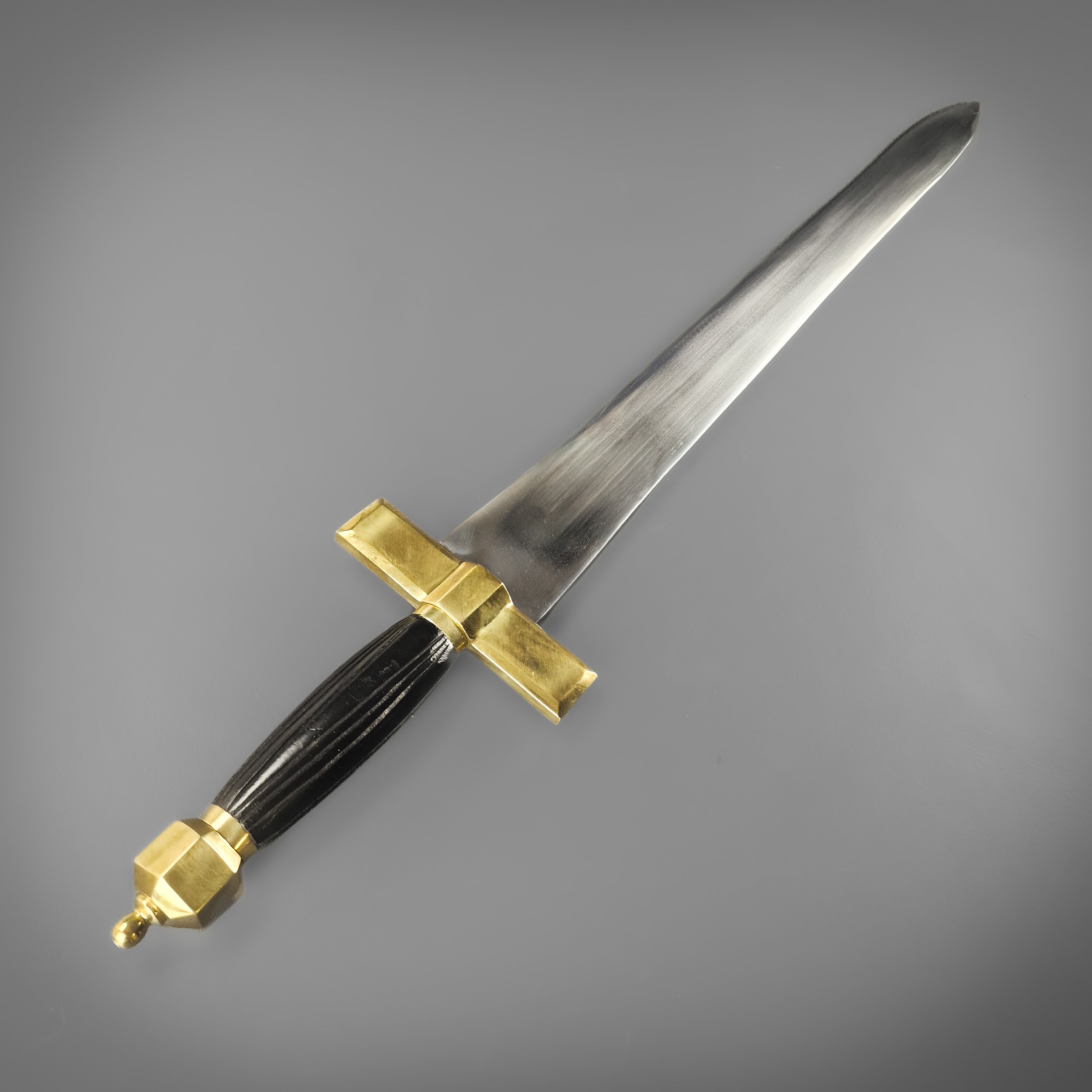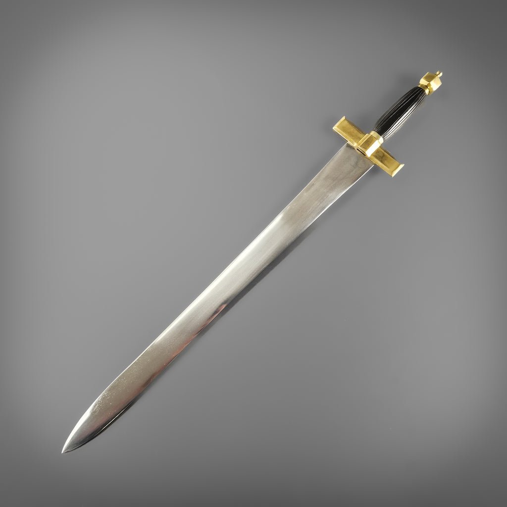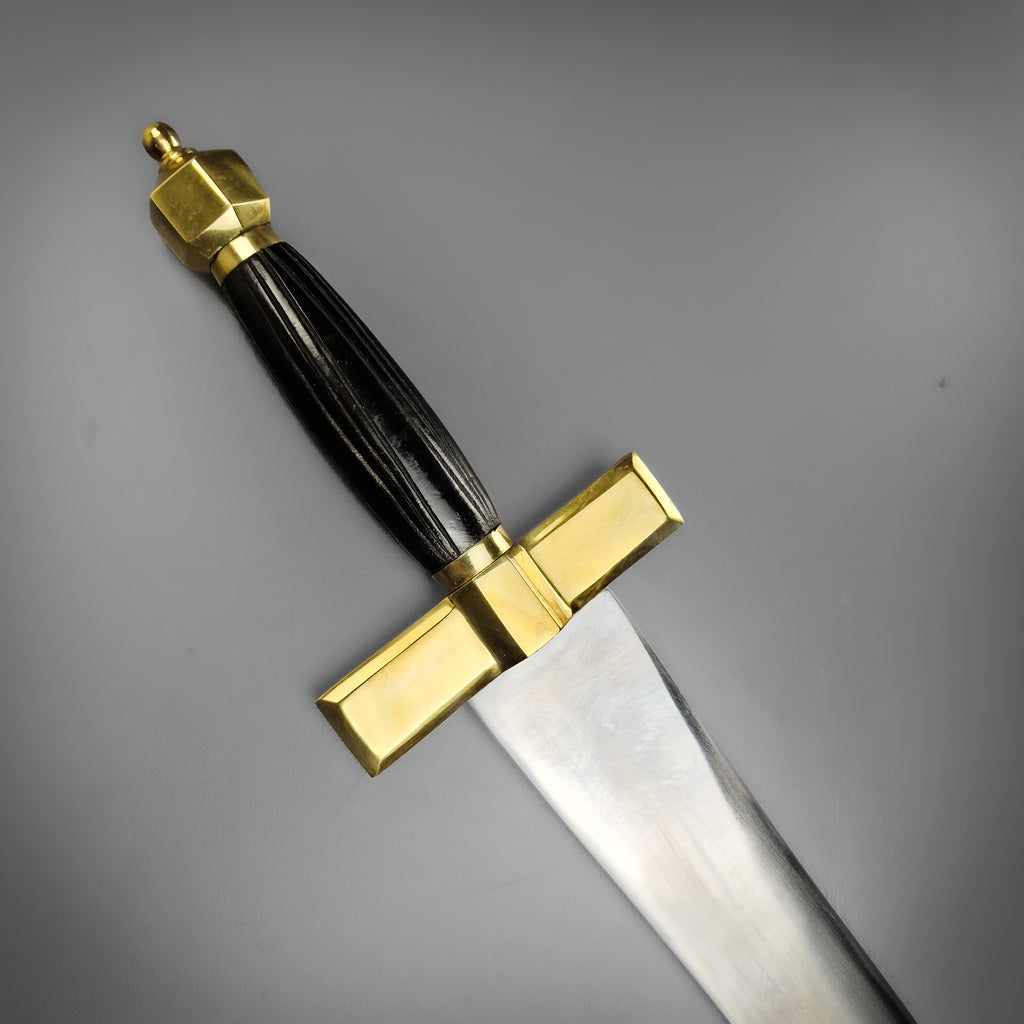 Designed as a trusty arming sword this versatile side carry was a standard sidearm for knights and men-at-arms from about the 10th century through the late Middle Ages. The blade waists slightly just before the tip giving it an elegant leaf like aesthetic, while the cross guard contrast with angular formed edges. The hilt is dark shaped wood with deep grooves for added grip and to top it off a there's a hexagonal crown pommel polished in brass.