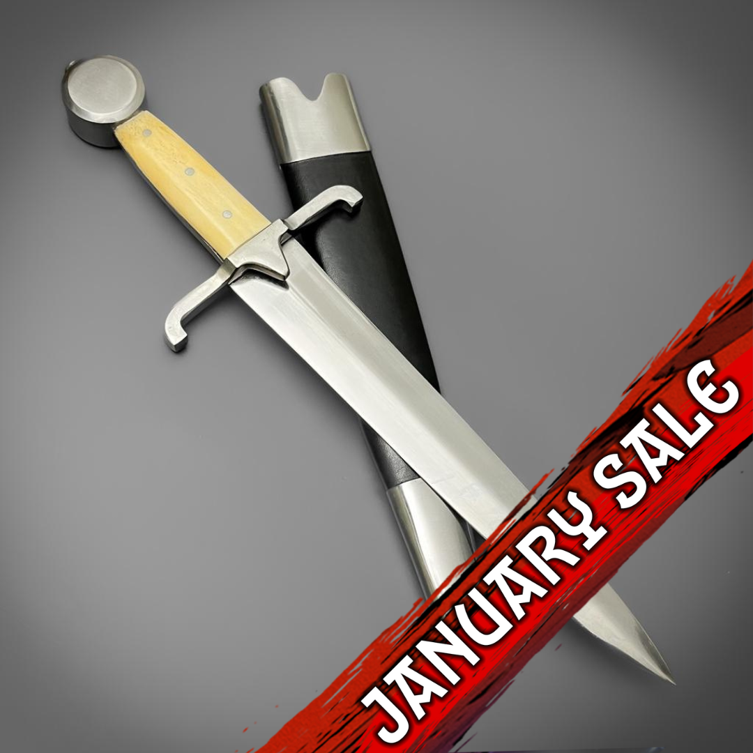 This is a replica of a dagger dating from the early 15th Century, featuring a faux bone handle and downturned quillions. This dagger is classic in design and weighty in the hand, a great addition to any collection.