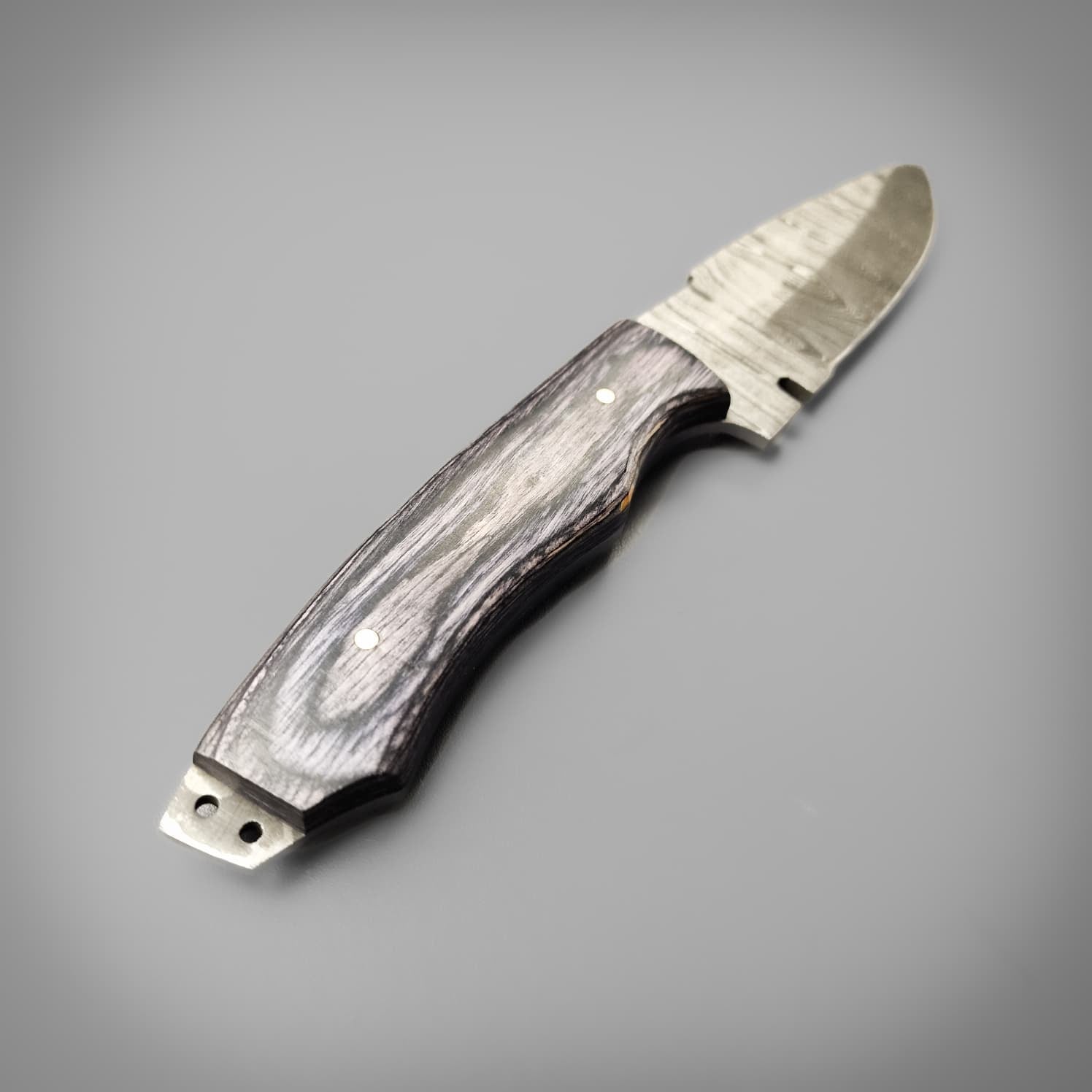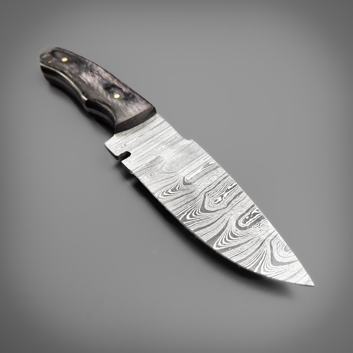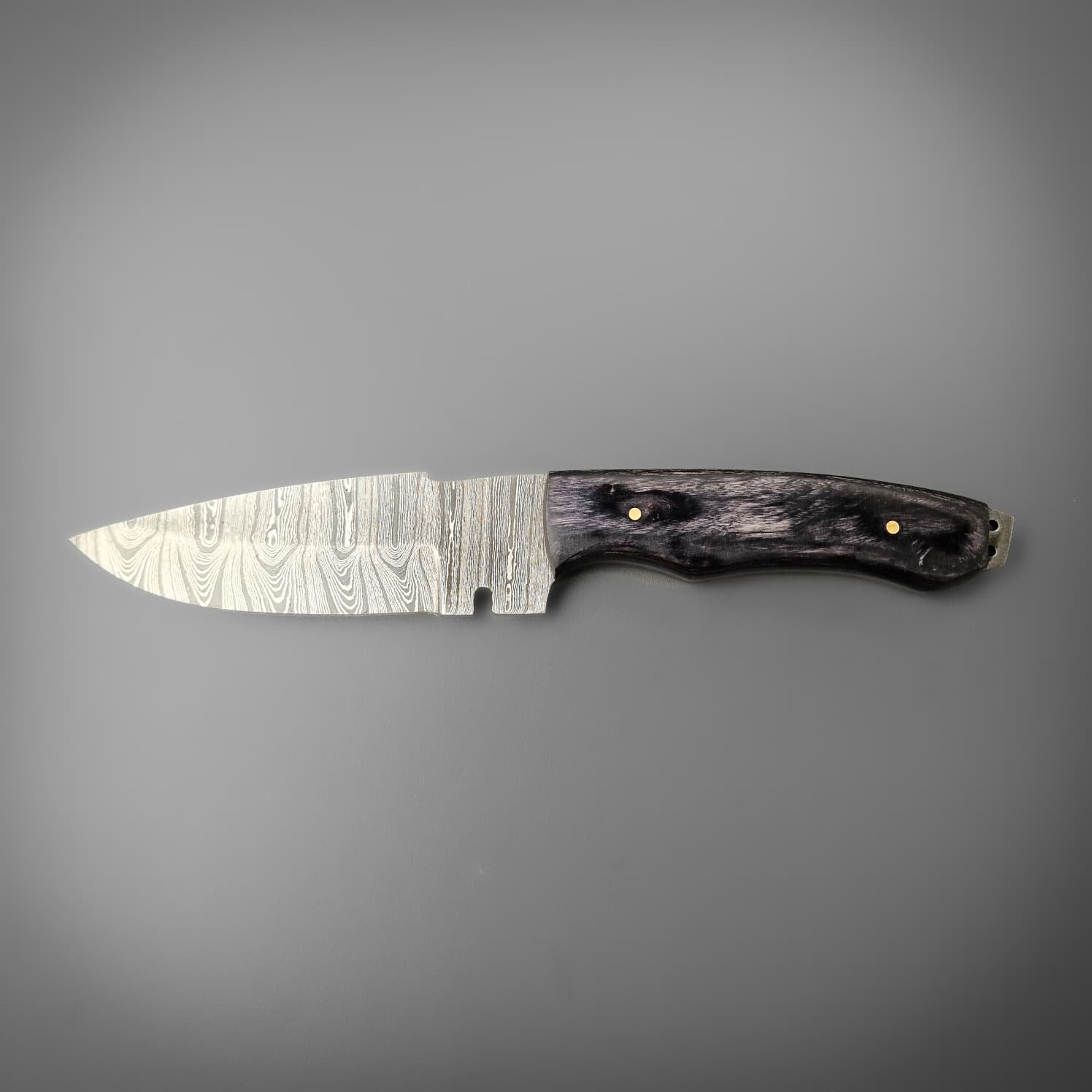 A stunning example of patterned Damascus running up to a polished wooden grip. This knife features a clip point blade profile, Complete with a sharpened edge and a rustic, hand-forged finish, this knife is fully functional and looks absolutely great. Housed in a handmade tan leather sheath.