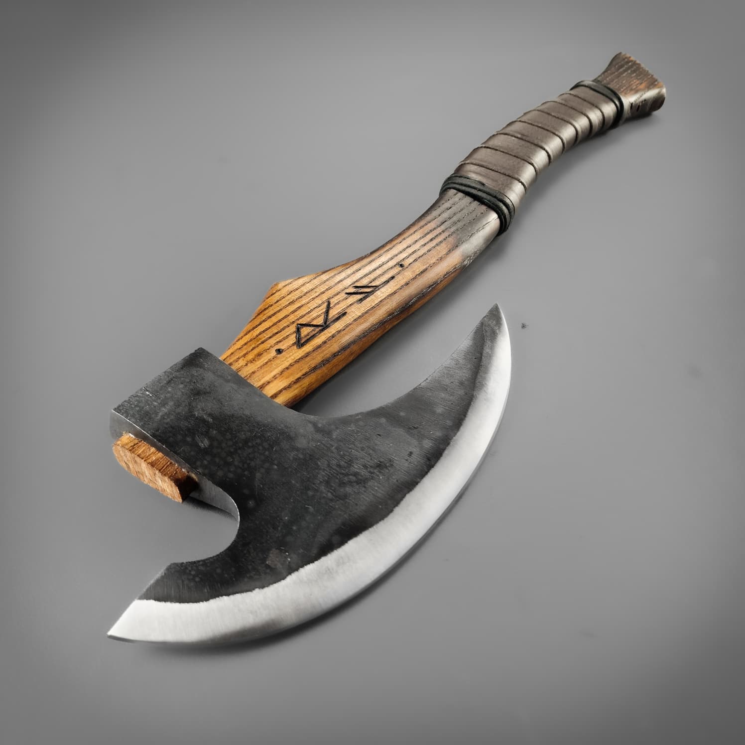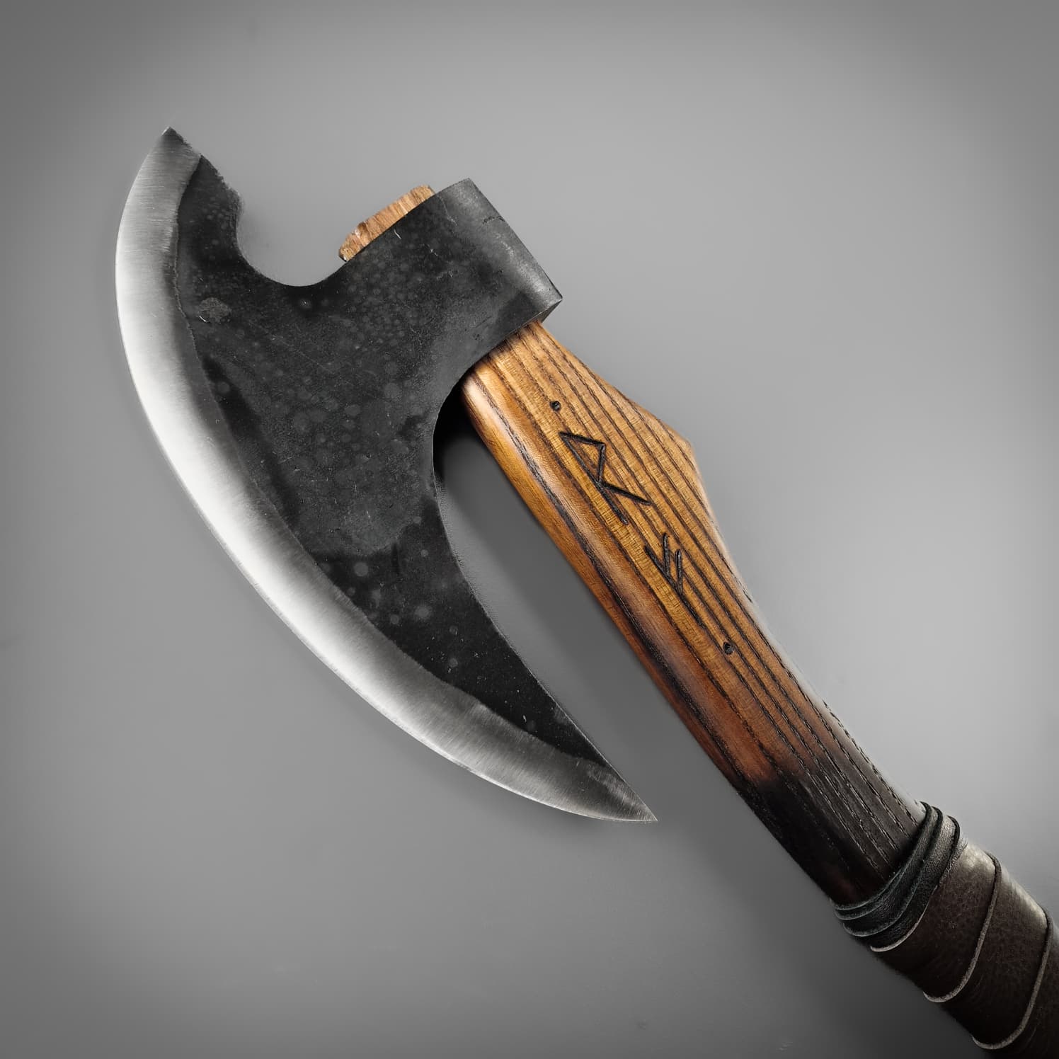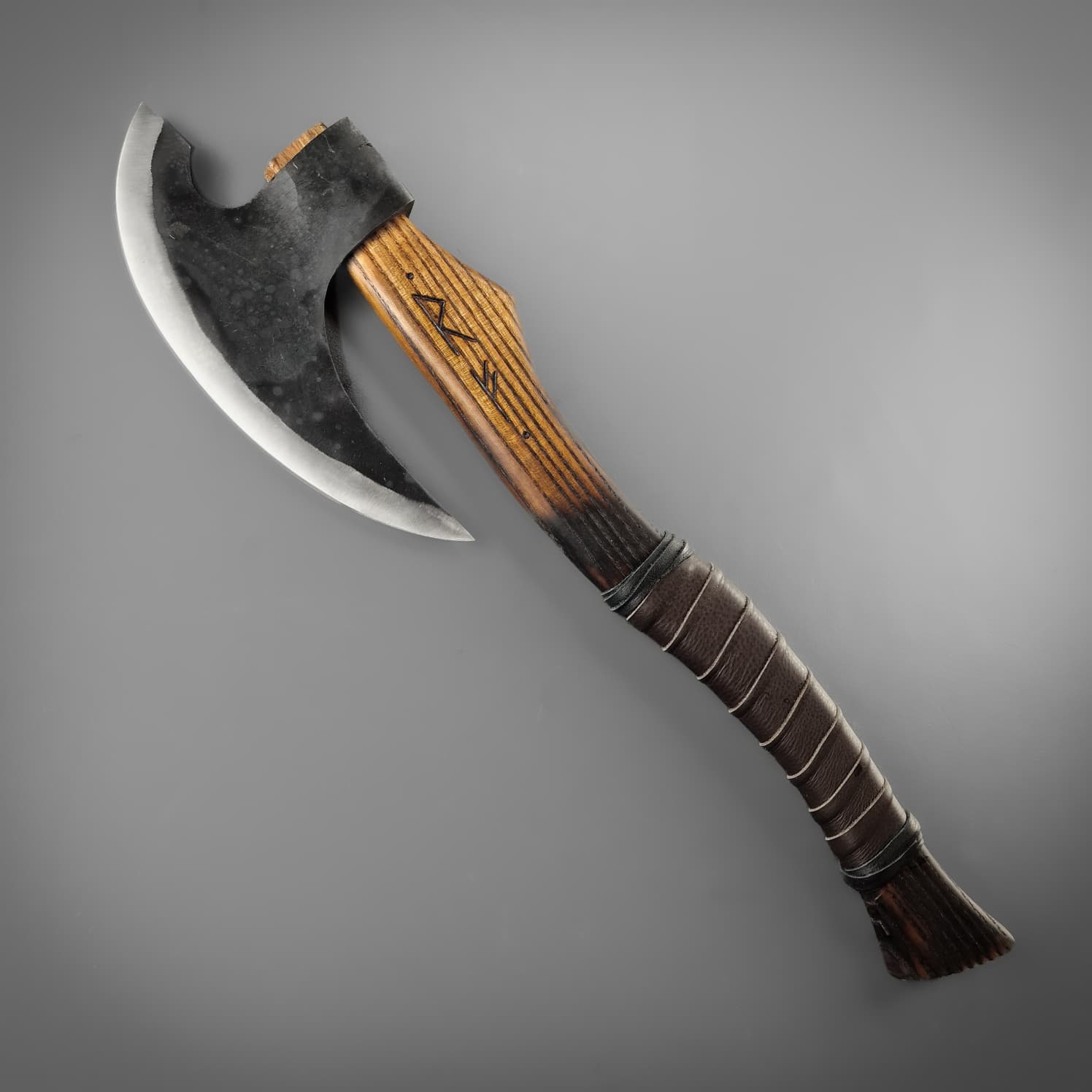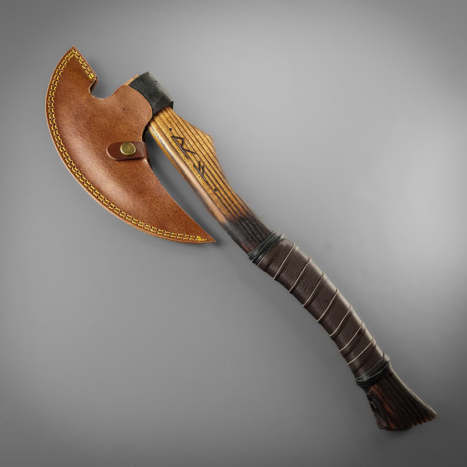 They're here! The pizza axe has been one of our best sellers since the near beginning of Raven Forge. It was only right that we put them on a a haft and customised them with a half burn, wax, chunky brown leather and and the Raven Forge initials burnt into the haft.